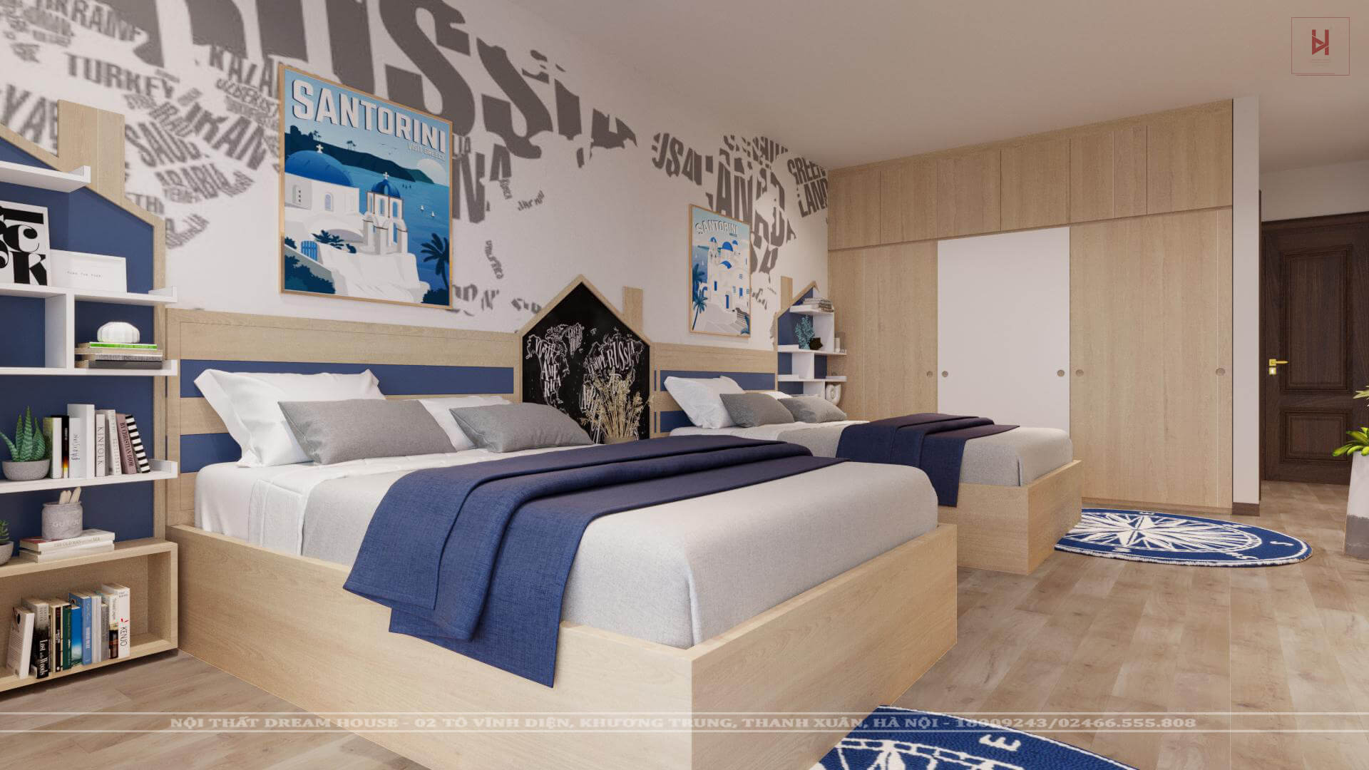 Thiết kế sử dụng mẫu giường đơn đặt cạnh nhau mang đến không gian độc lập nhưng vẫn có sự gắn kết với nhau bởi tap đầu giường. Nội thất trong phòng bao gồm giường ngủ, tủ quần áo, tab đầu giường,giấy dán tường họa tiết, tranh treo tường, giá sách...Hy vọng với căn phòng ngủ cho bé trai này sẽ mang lại cho bạn nhiều ý tưởng thiết kế phù hợp cho phòng ngủ bé trai của gia đình bạn.Nếu bạn đang có nhu cầu thiết kế nội thất phòng ngủ cho bé trai, thi công nội thất phòng ngủ hiện đại thì hãy liên hệ với chúng tôi để được tư vấn miễn phí và đưa ra những giải pháp tối ưu cho căn nhà của bạn.