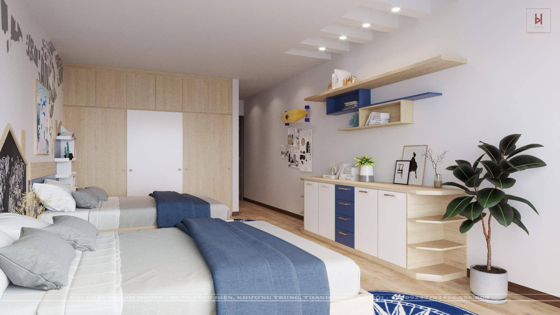 Thiết kế sử dụng mẫu giường đơn đặt cạnh nhau mang đến không gian độc lập nhưng vẫn có sự gắn kết với nhau bởi tap đầu giường. Nội thất trong phòng bao gồm giường ngủ, tủ quần áo, tab đầu giường,giấy dán tường họa tiết, tranh treo tường, giá sách...Hy vọng với căn phòng ngủ cho bé trai này sẽ mang lại cho bạn nhiều ý tưởng thiết kế phù hợp cho phòng ngủ bé trai của gia đình bạn.