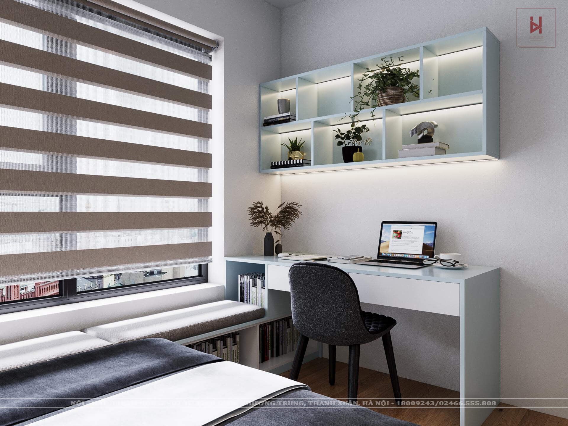 Bàn học được thiết kế gần cửa sổ để hướng ánh sáng tự nhiên cho bé học bài. Hệ thống giá sách và kệ lớn giúp bé tha hồ lưu giữ và bày trí những món đồ cần thiết mà không khiến phòng ngủ trở nên bừa bộn.