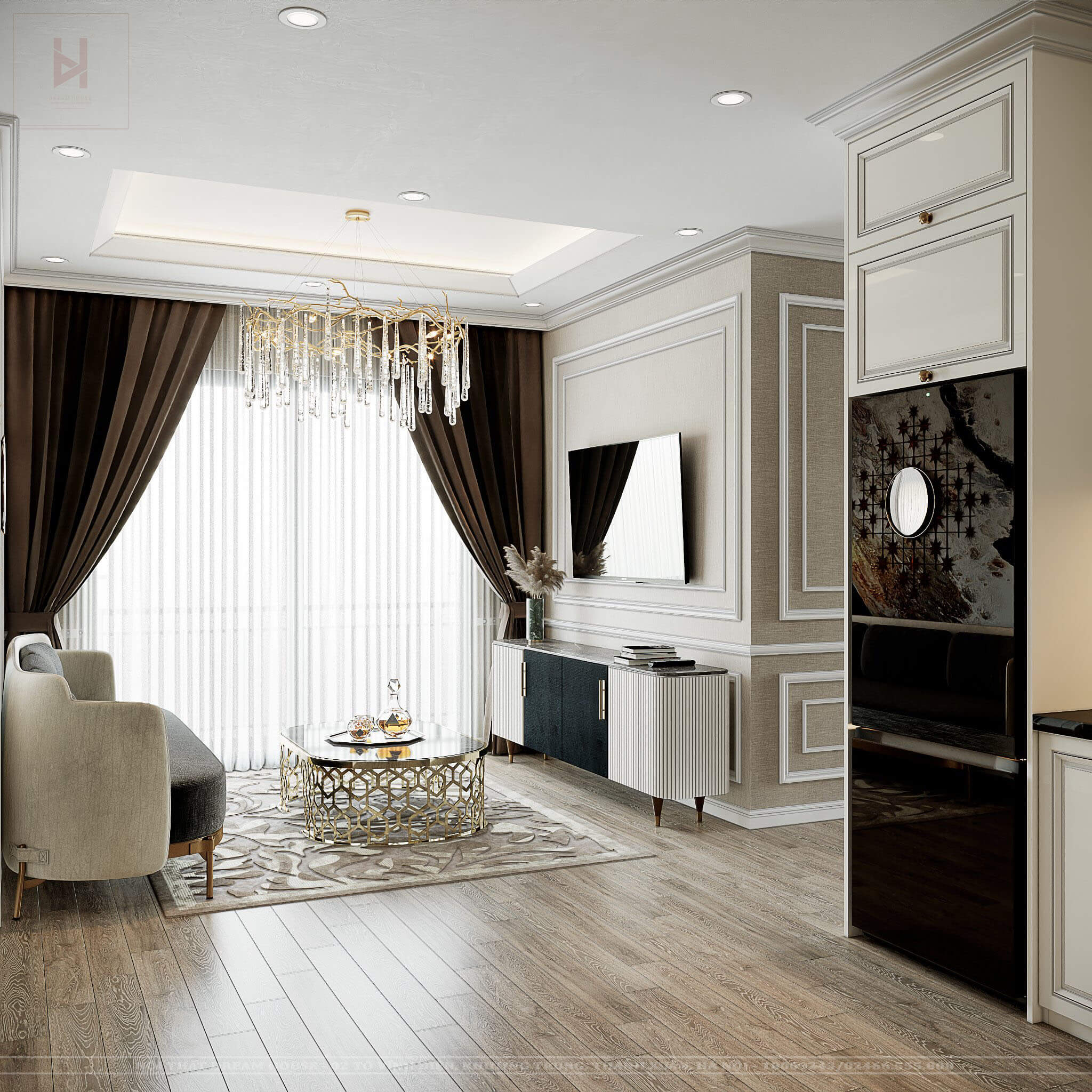 Phòng khách được thiế kế với 1 bộ sofa bọc nỉ cao cấp, Bàn trà chân sắt mạ kẽm mặt bàn đá sang trọng kết hợp cùng 1 chiếc thảm lông cực kì ấm áp cho mùa đông này. Kệ tivi phong cách bán tân cổ diển sẽ là dạng cso đường cong bo tròn, có các đường phào chỉ tạo nên các hoa văn đẹp cho hạng muc.