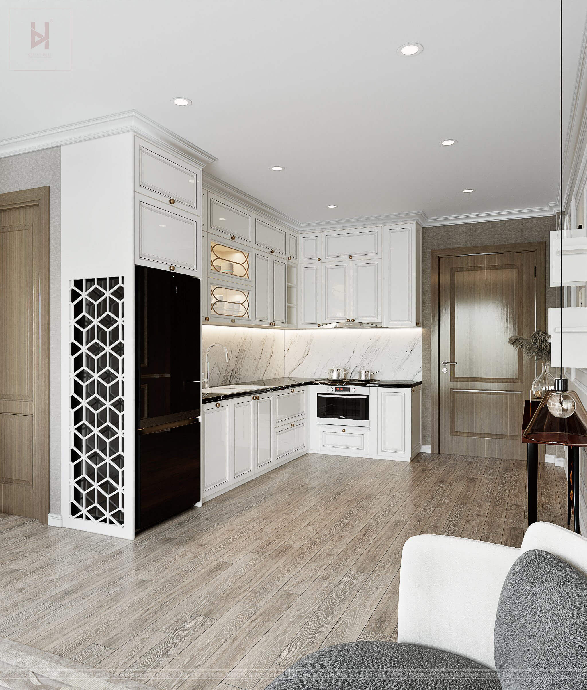 Tủ bếp được thiết kế với cánh tru soi đường phào chỉ, nét đặc trưng của phong cách tân cổ điển, đặc biệt các núm tay cầm được thiết kế sát mép cánh thay vì để giữa cánh như cánh tủ áo, vị trí đặt tay nắm như vậy giúp việc lấy đồ từ các khoang tủ sẽ dễ dàng hơn.