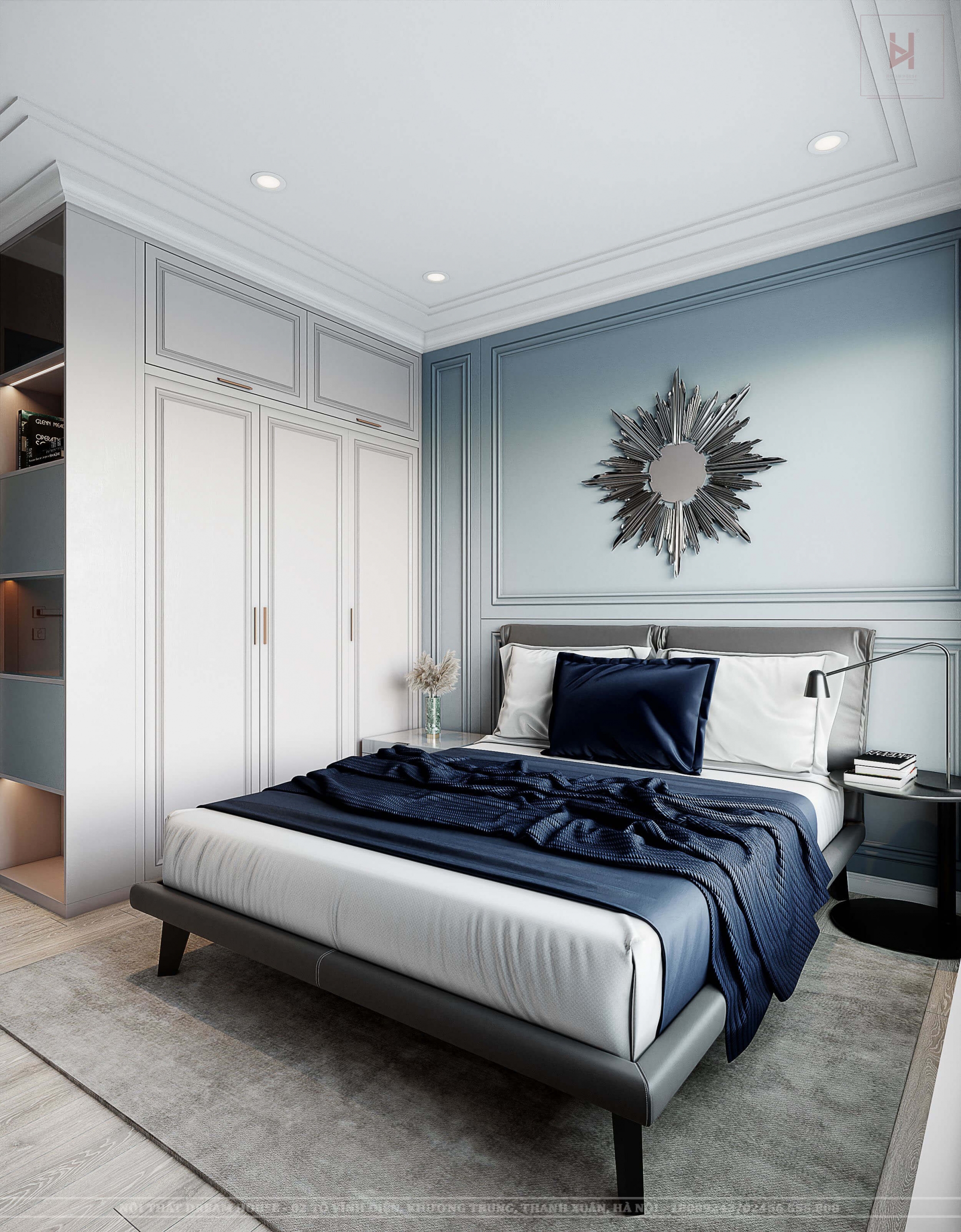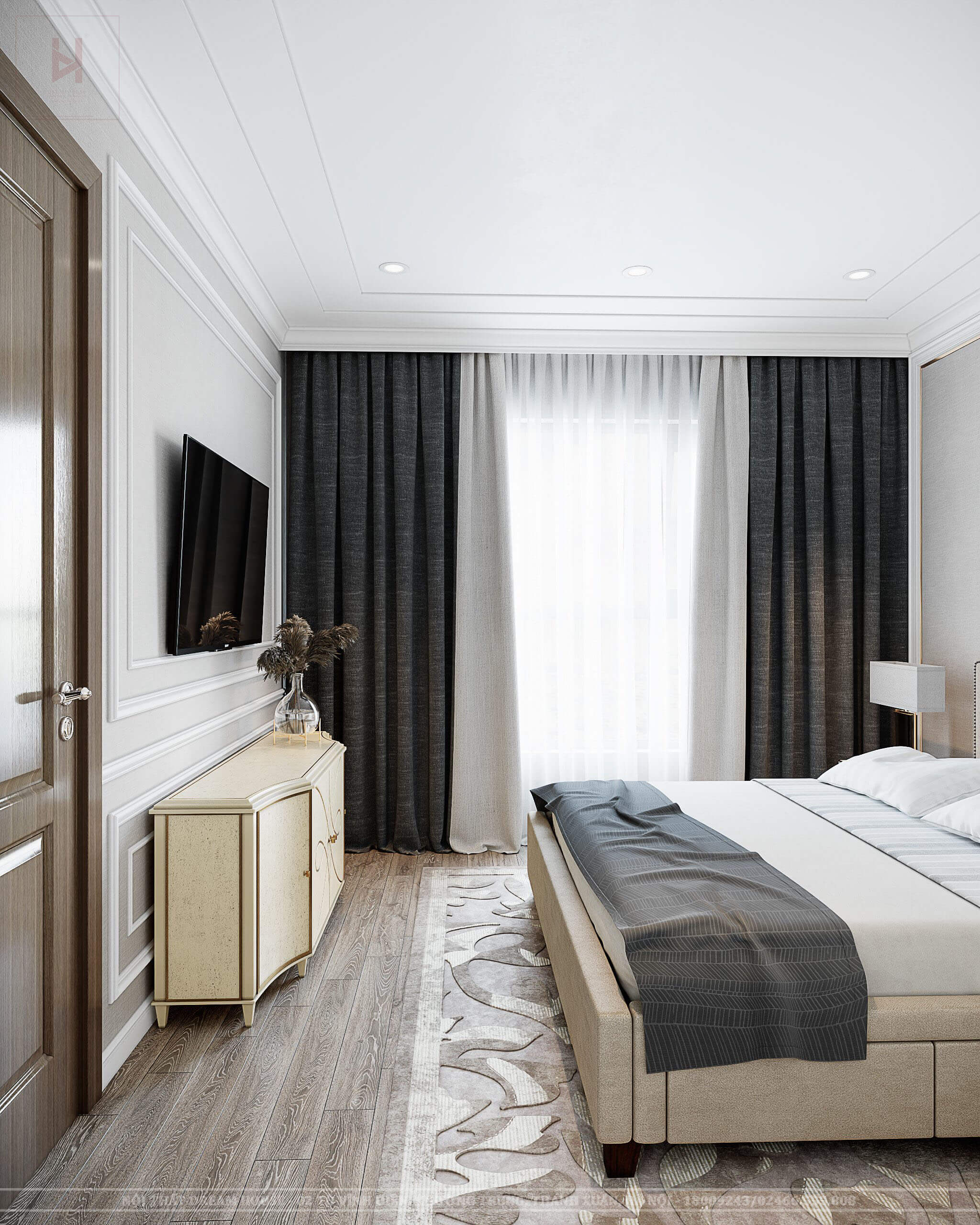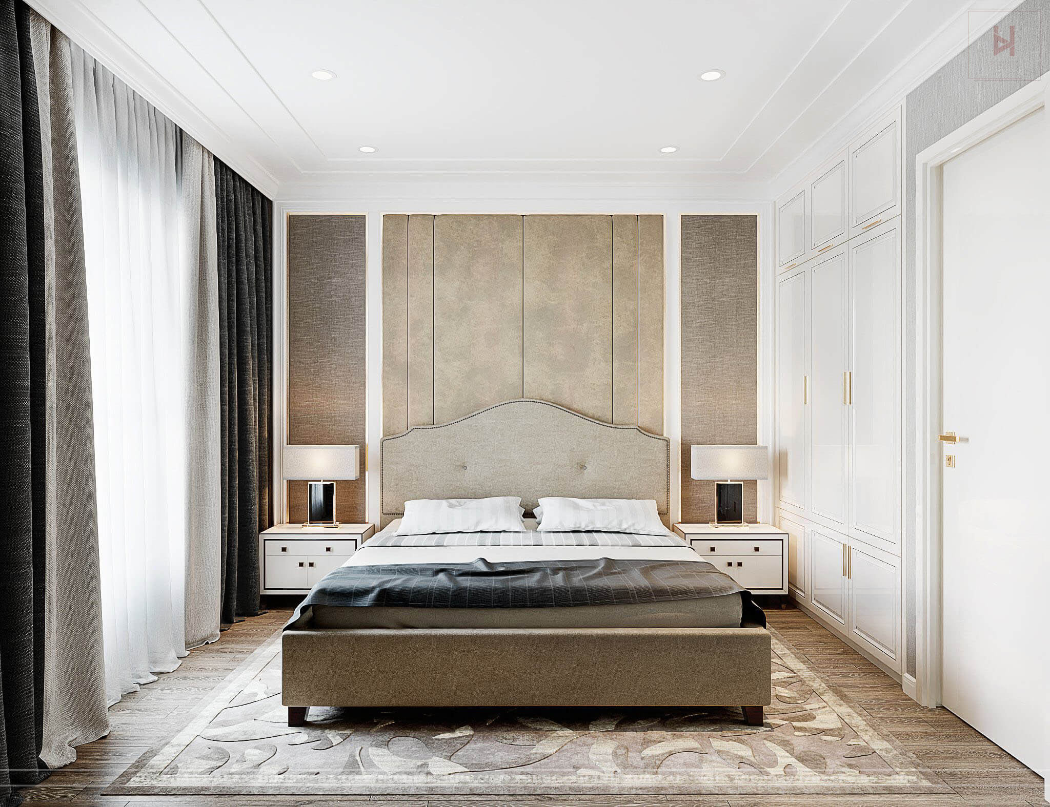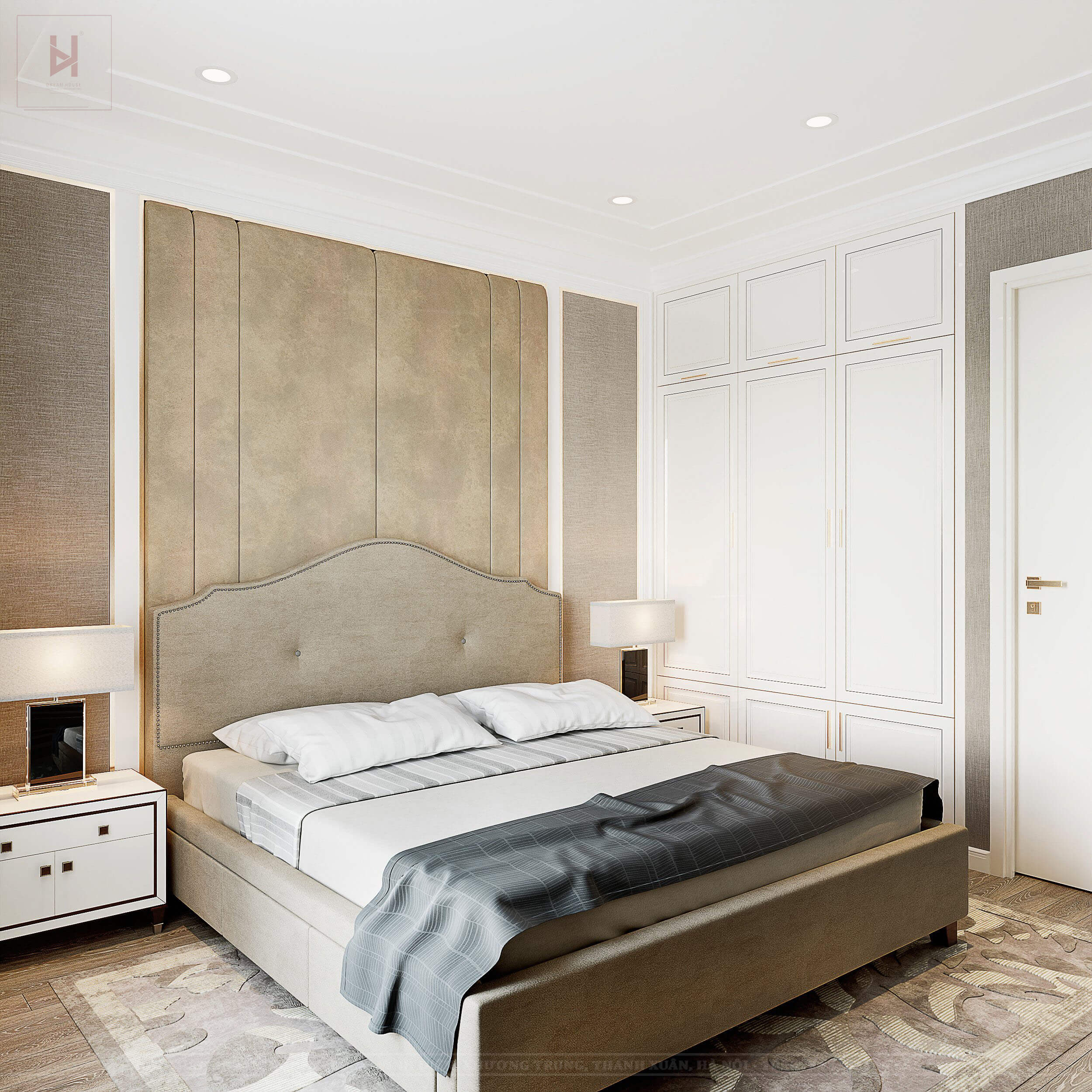 Phòng ngủ master được thiết kế phối kết hợp giữa phong cách hiện đại và tân cổ điển. Giường ngủ bọc nỉ theo phong cách hiện đại trẻ trung, tủ áo, tab đầu giường cánh được thiết kế phào chỉ mĩ lệ của phong cách tân cổ eeirrn tất cả tạo nên không gian sông hoàn hảo.