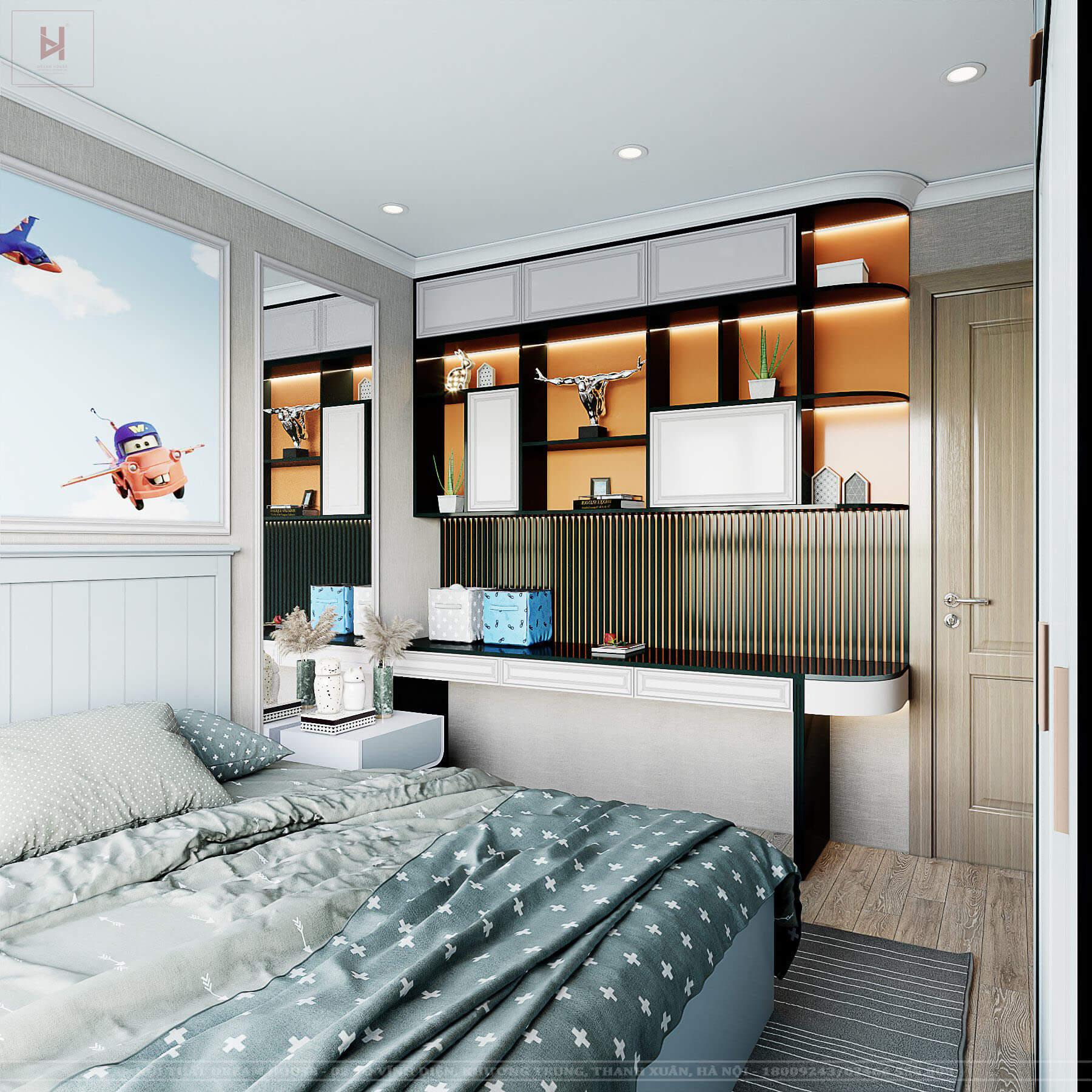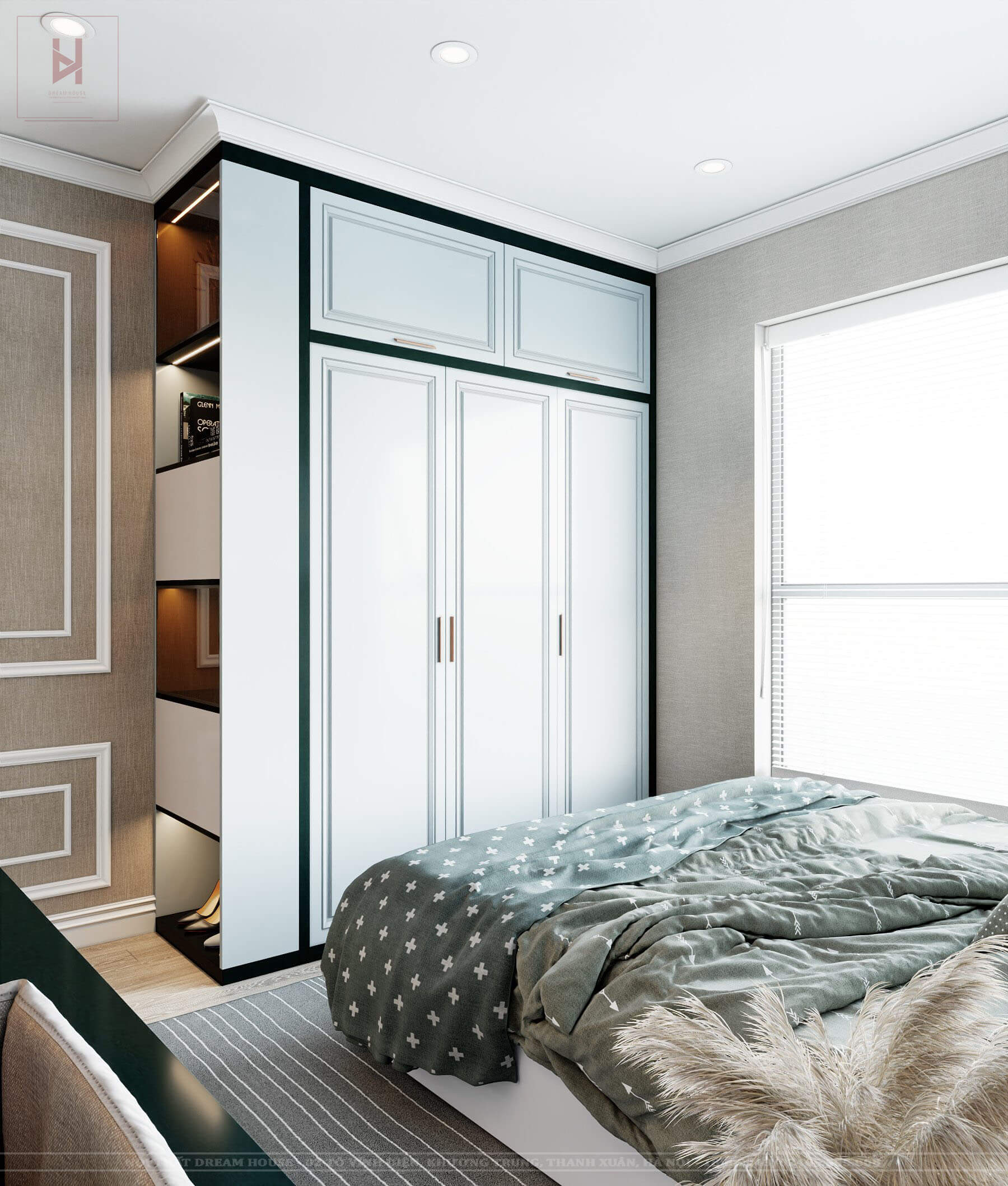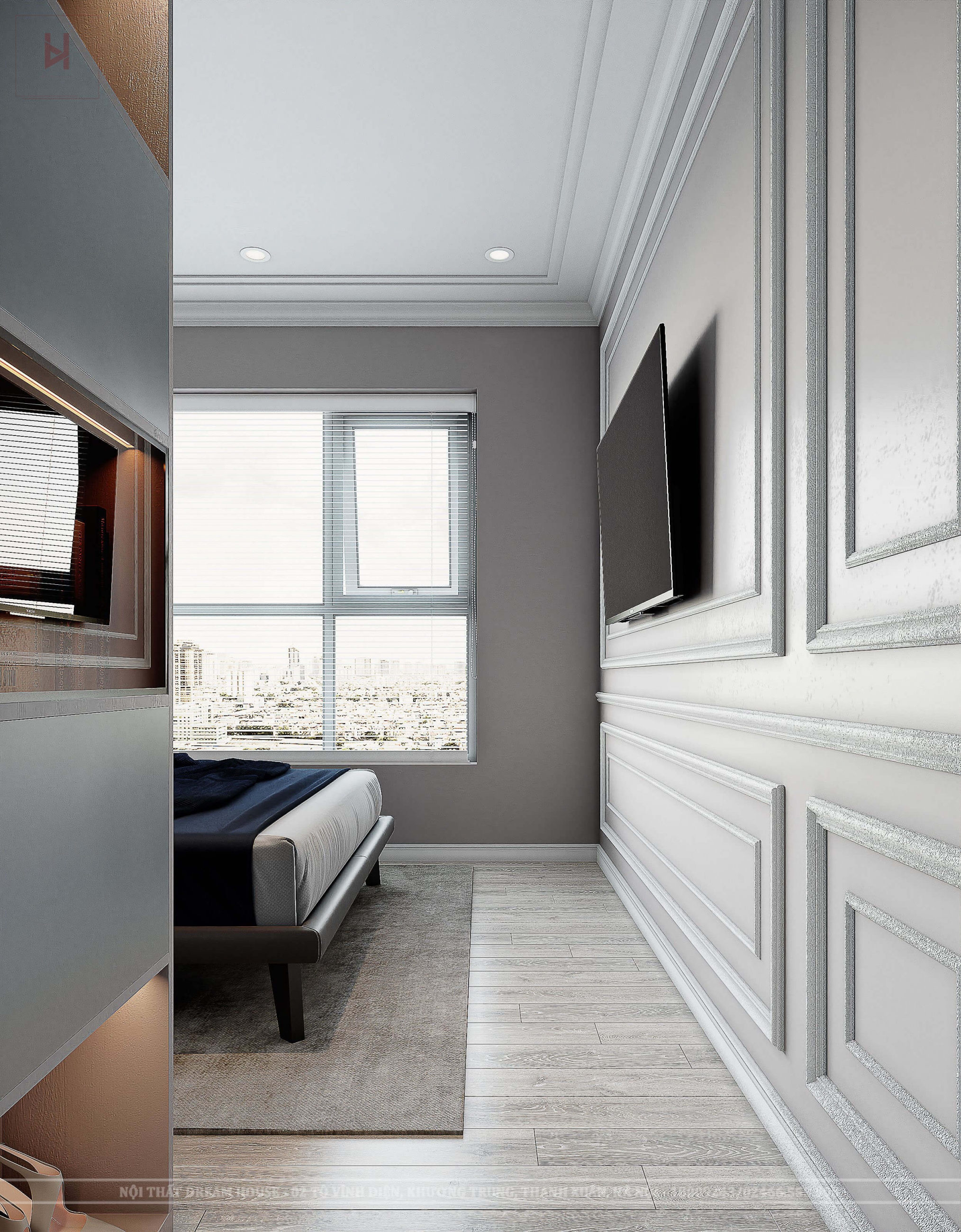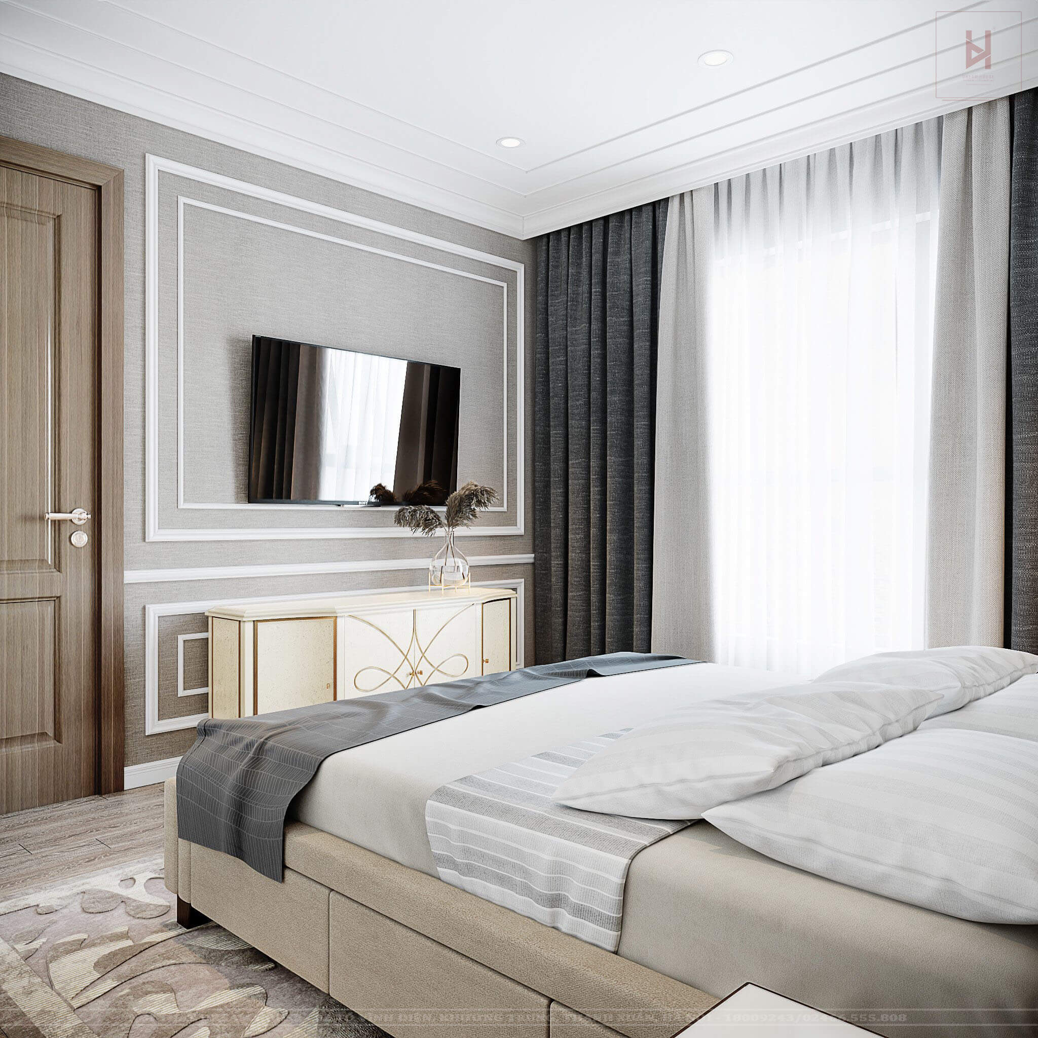 Phòng ngủ master được thiết kế phối kết hợp giữa phong cách hiện đại và tân cổ điển. Giường ngủ bọc nỉ theo phong cách hiện đại trẻ trung, tủ áo, tab đầu giường cánh được thiết kế phào chỉ mĩ lệ của phong cách tân cổ eeirrn tất cả tạo nên không gian sông hoàn hảo.