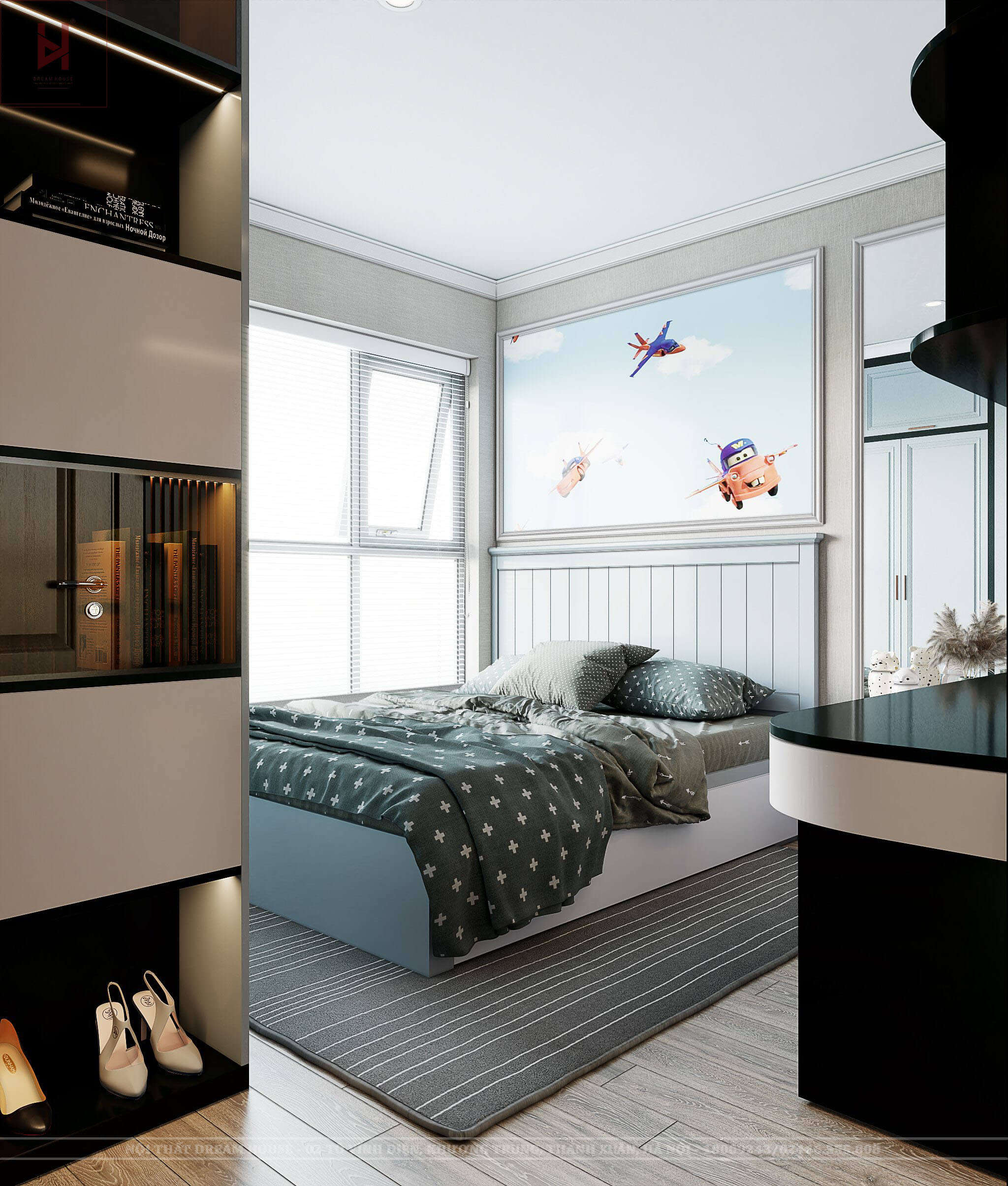 Phòng ngủ nhỏ 1 được thiết kế nhẹ nhành, thanh thoát với gam màu trắng, giường ngủ làm theo phong cách hiện đại với đường thẳng khỏe, các đường các phào chỉ được dành để thiết kế cho các cánh tủ áo, đây là sự kết hợp hoàn hảo giữa phong cách hiện đại và tân cổ điển tạo nên phong cách bán tân cổ điển.