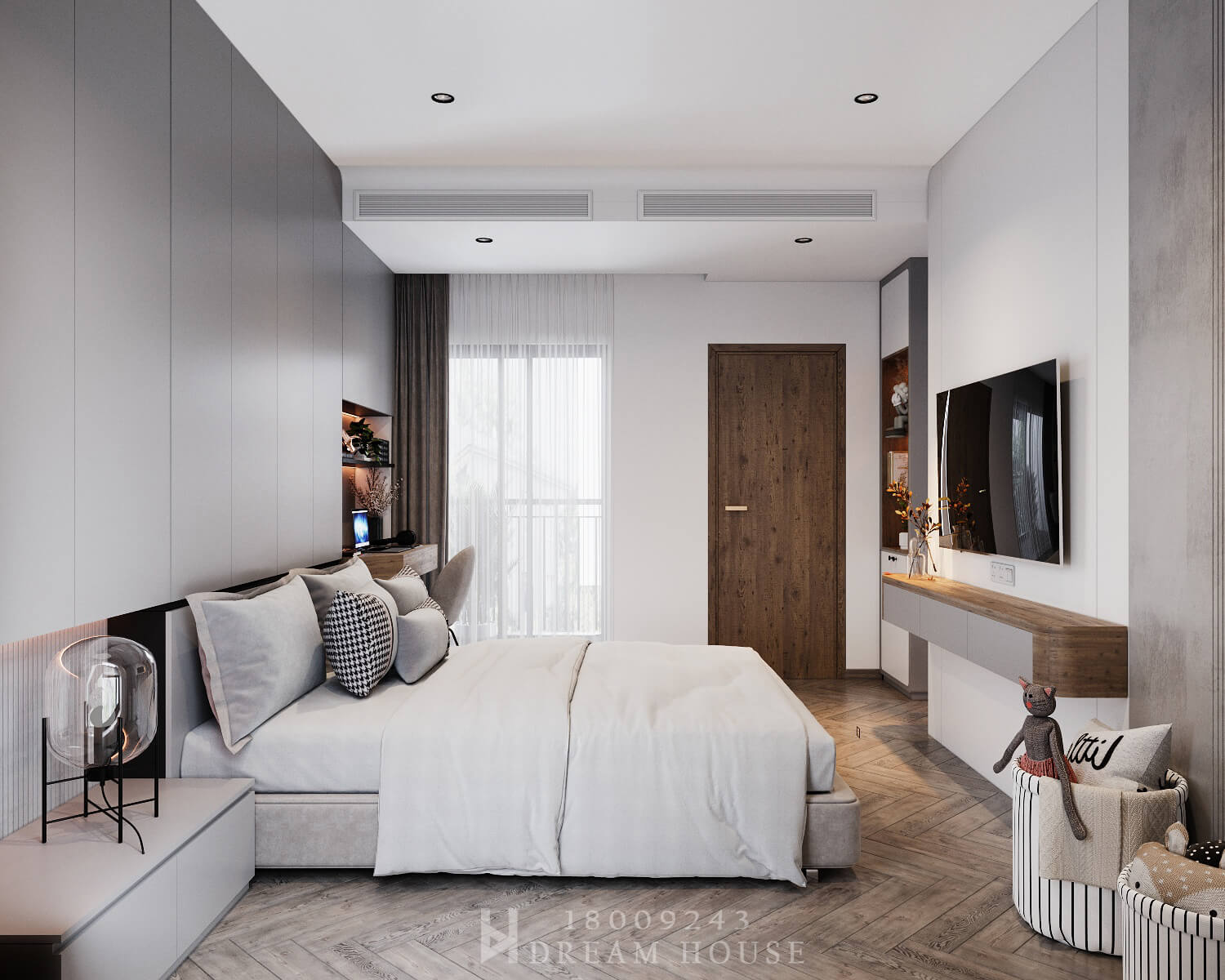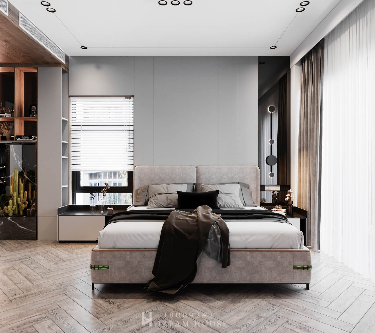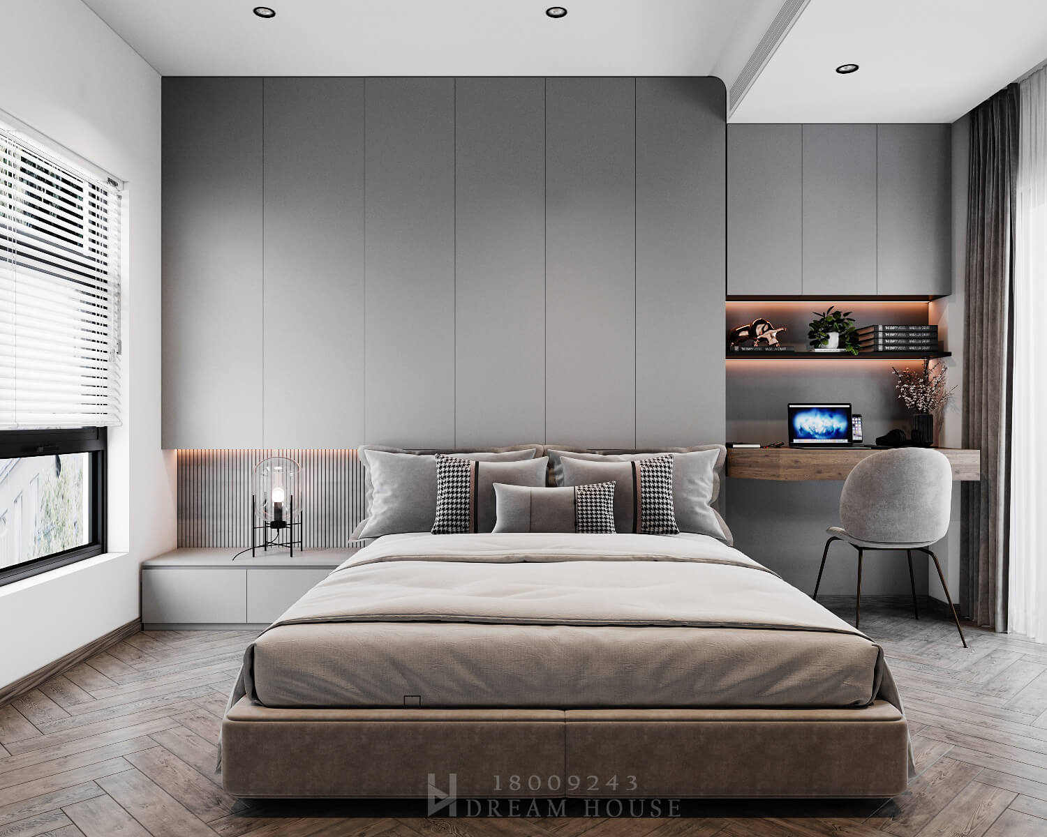 Với thiết kế phòng ngủ này, màu sắc được lựa chọn là tone ghi xám. nhẹ nhàng, thoáng mát tươi trẻ.
