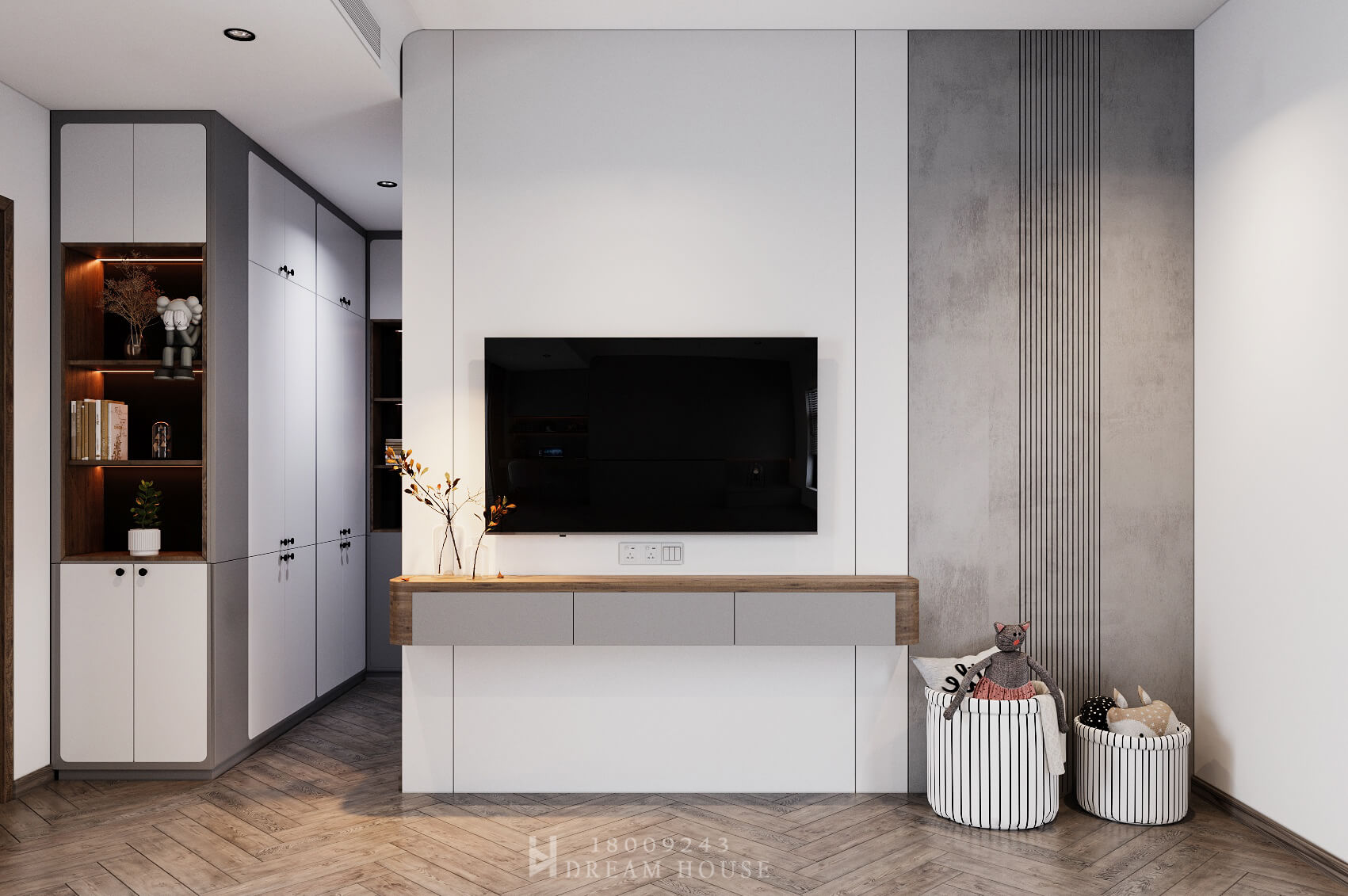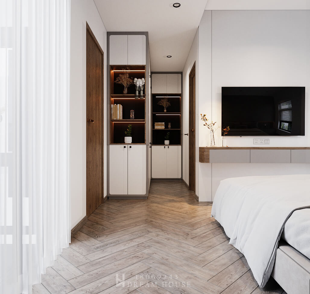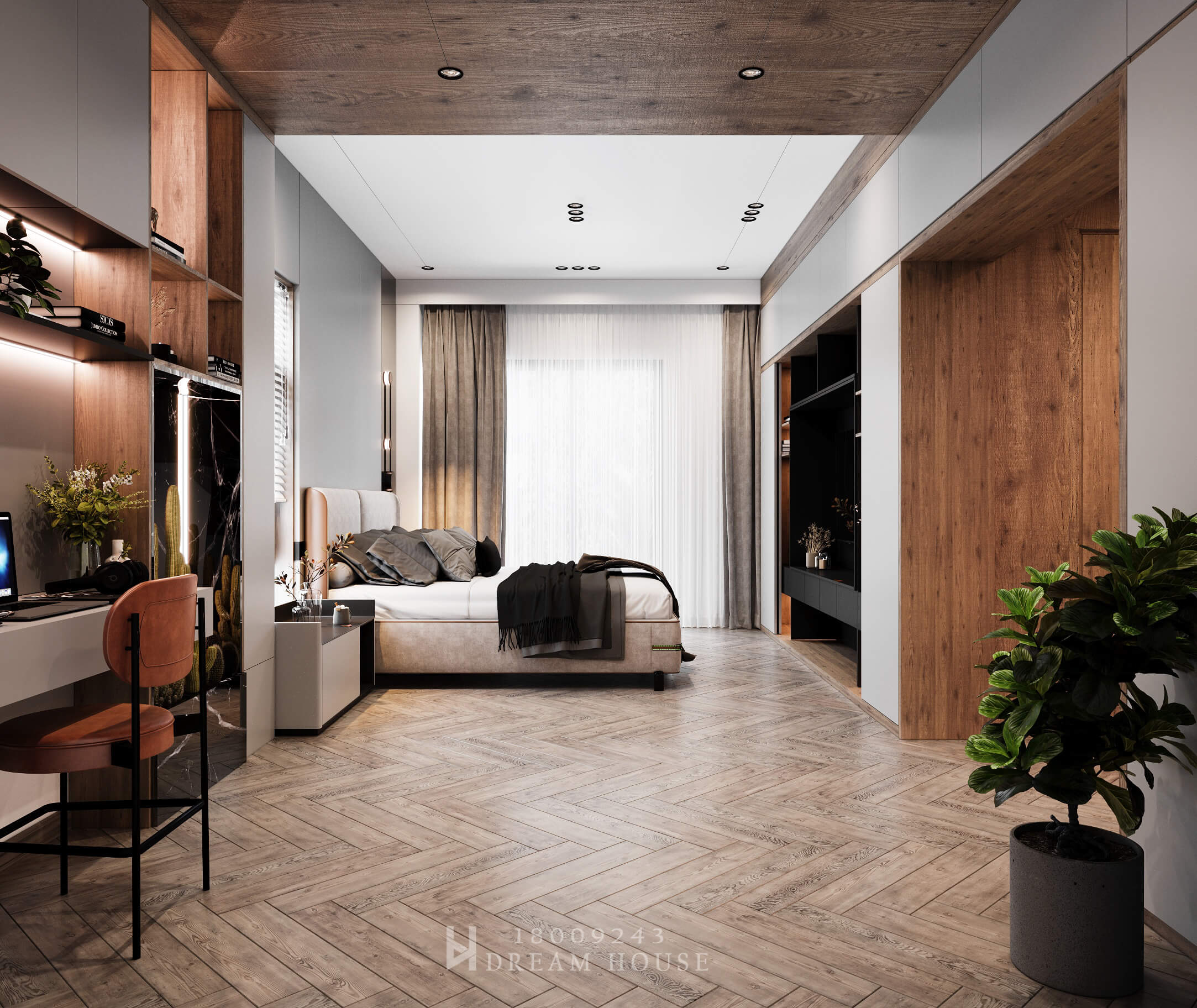 Với thiết kế phòng ngủ này, màu sắc được lựa chọn là tone ghi xám. nhẹ nhàng, thoáng mát tươi trẻ.