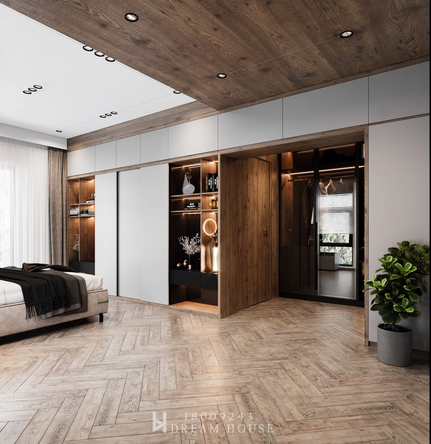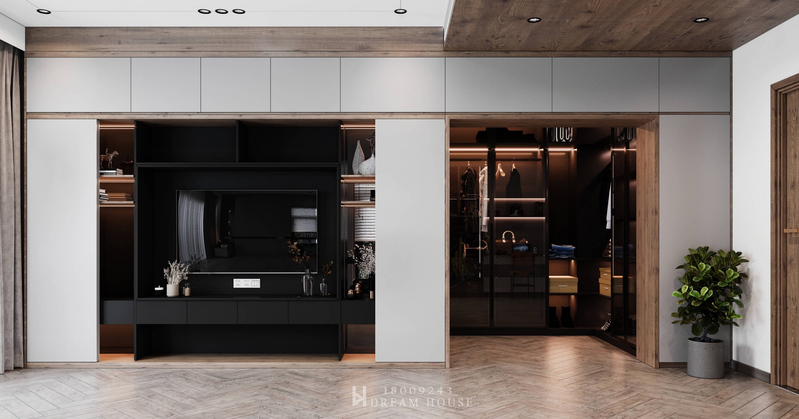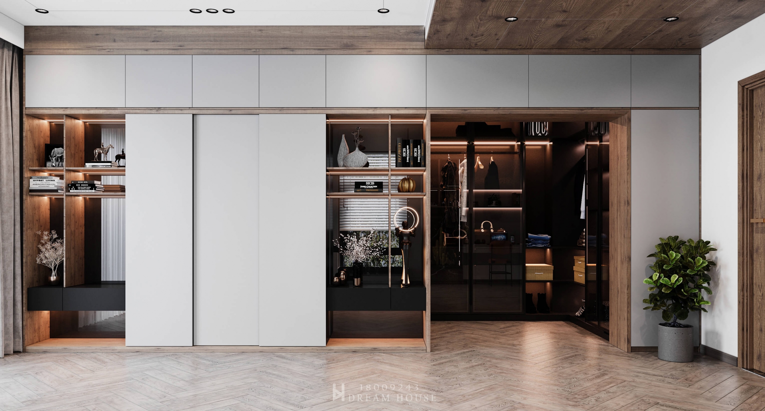 Hệ tủ quần áo và tủ trang trí được đặt sát nhau tạo nên không gian hoàng gia cho bạn.