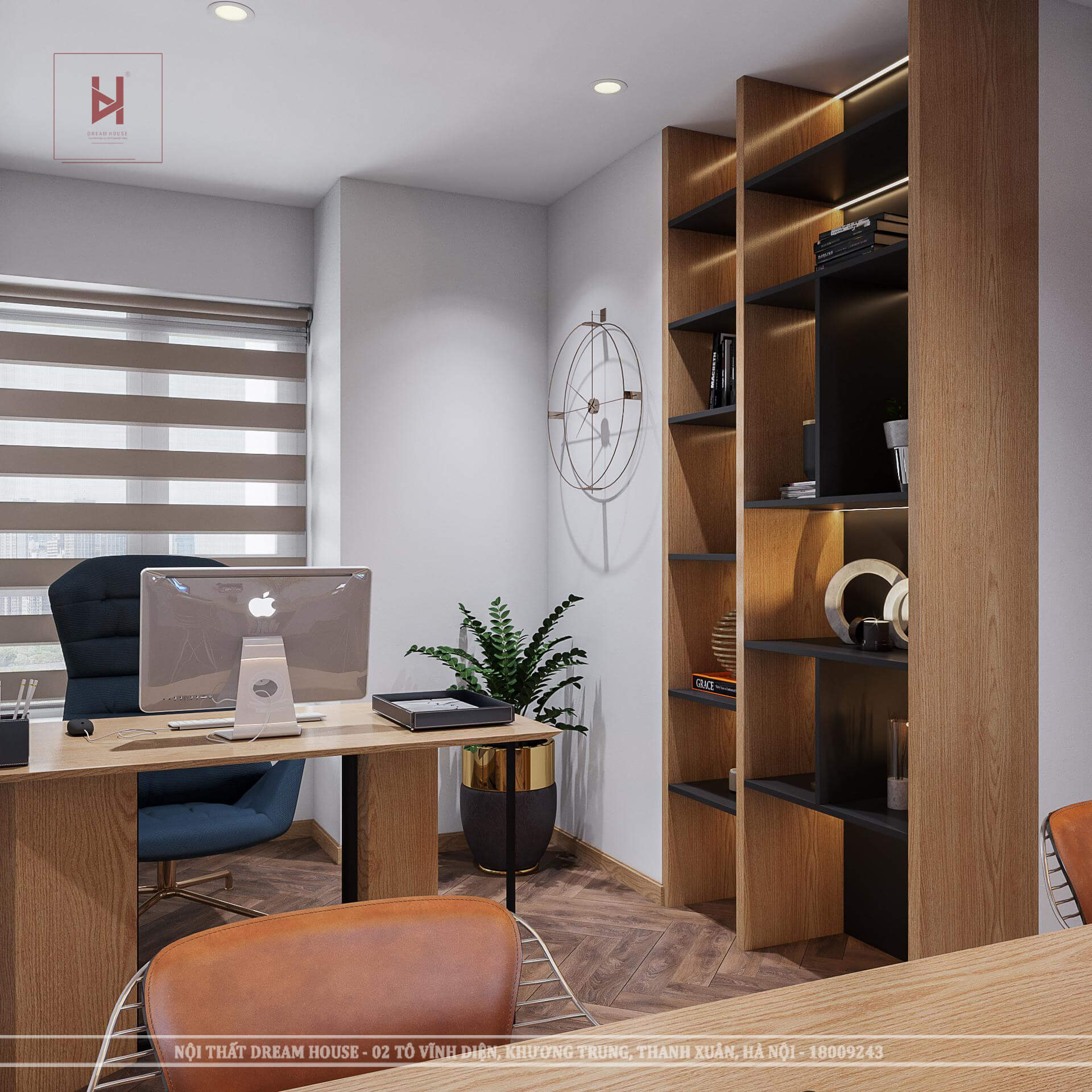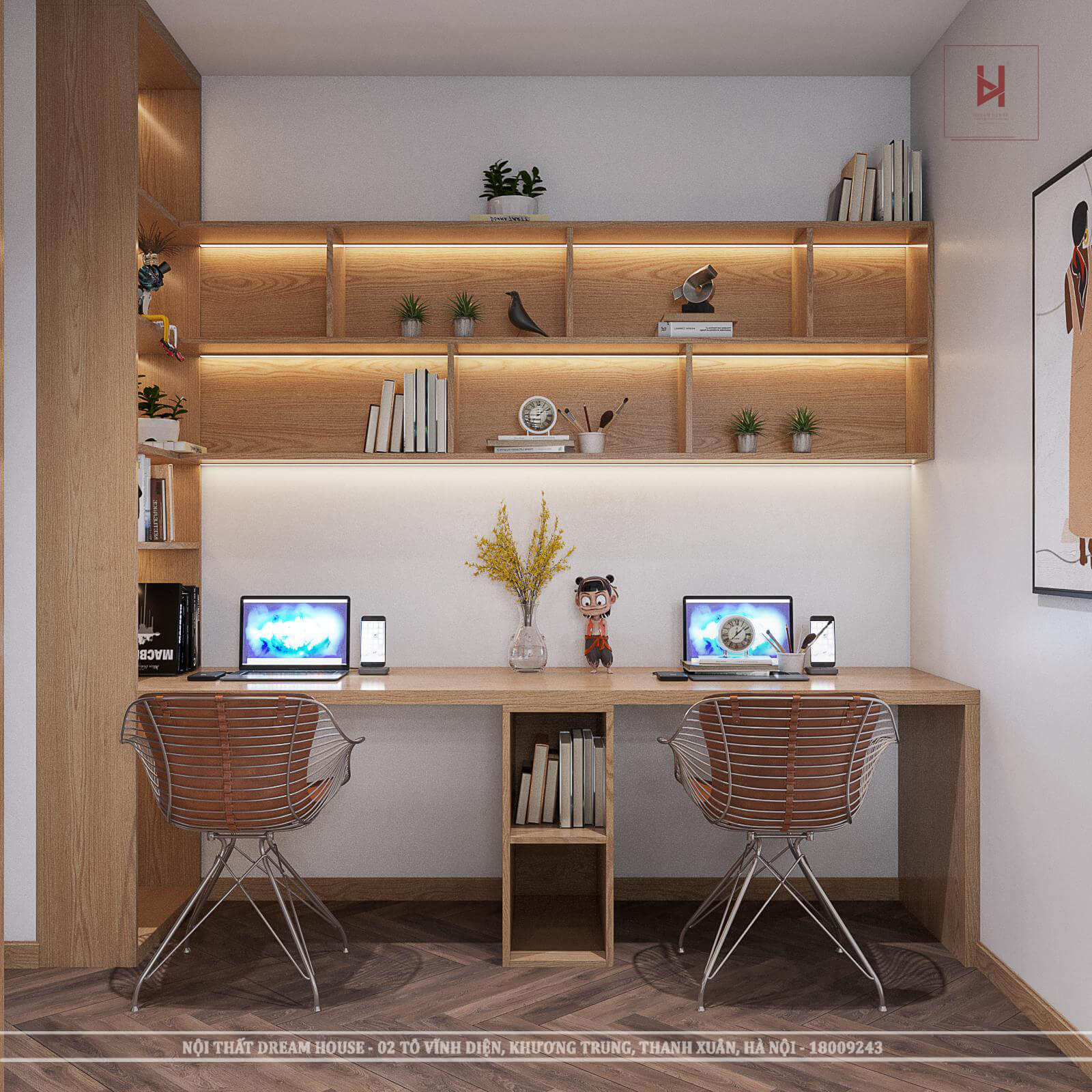 Phòng làm việc với tối ưu tiết kiệm diện tích và giải phóng không gian mà vẫn đủ được toàn bộ cả gia đình học tập và làm việc.