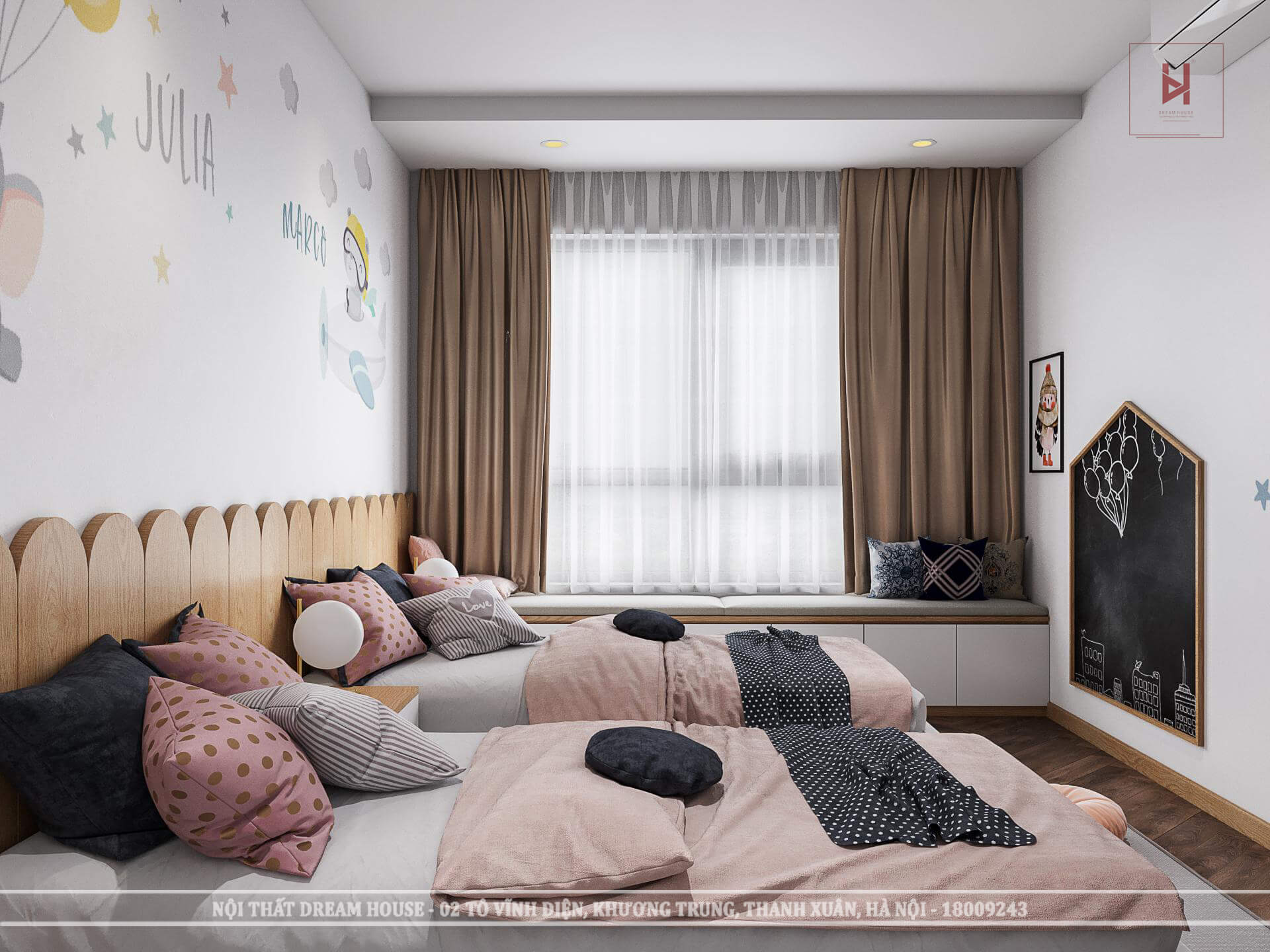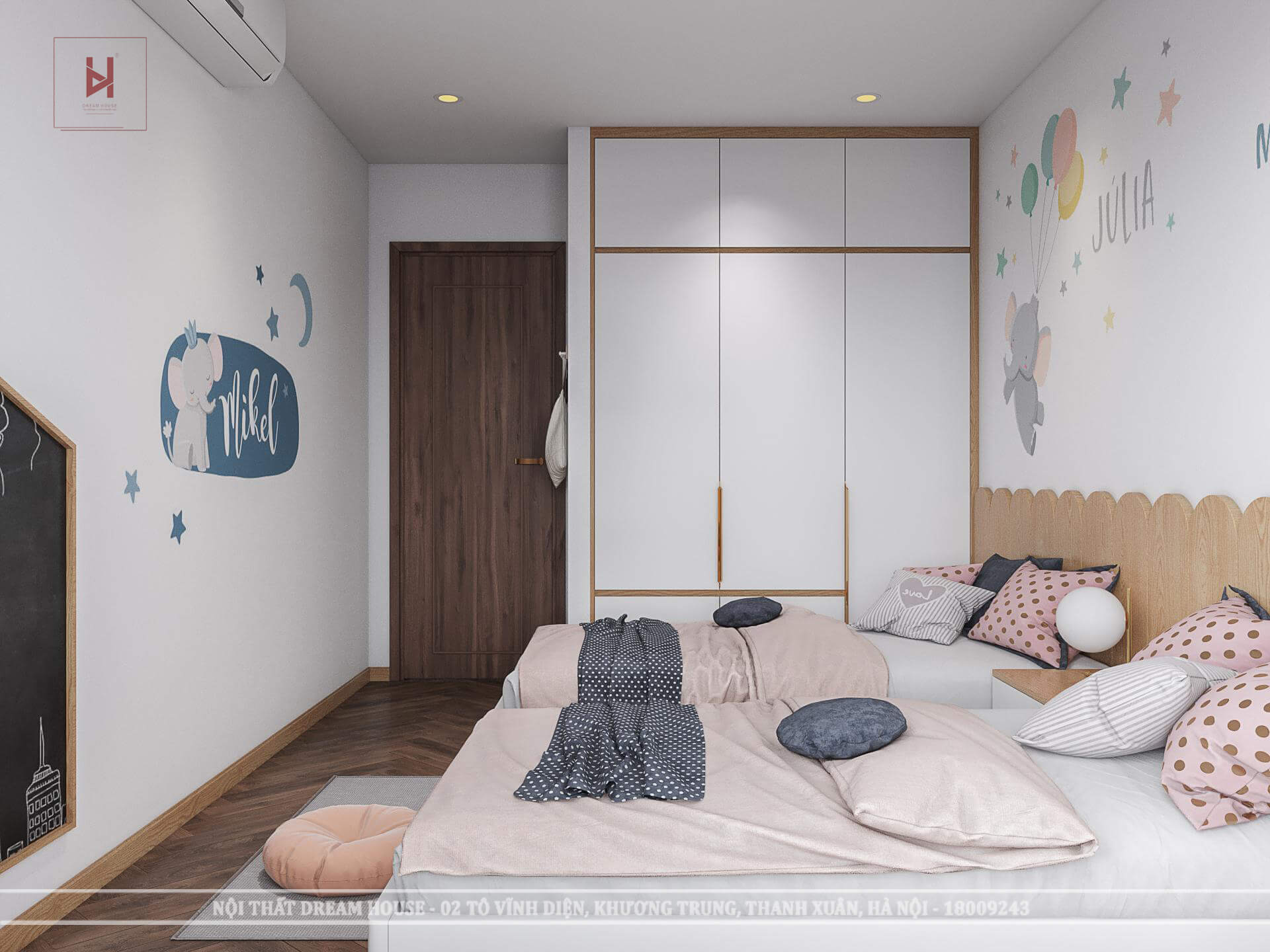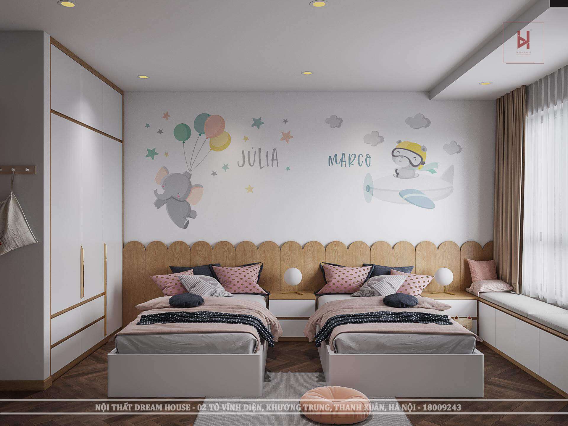 Phòng ngủ con, với thiết kế cho 2 giường cho 2 bé mà không gian vẫn thoáng và thoải mái cho bé ngủ ngon.