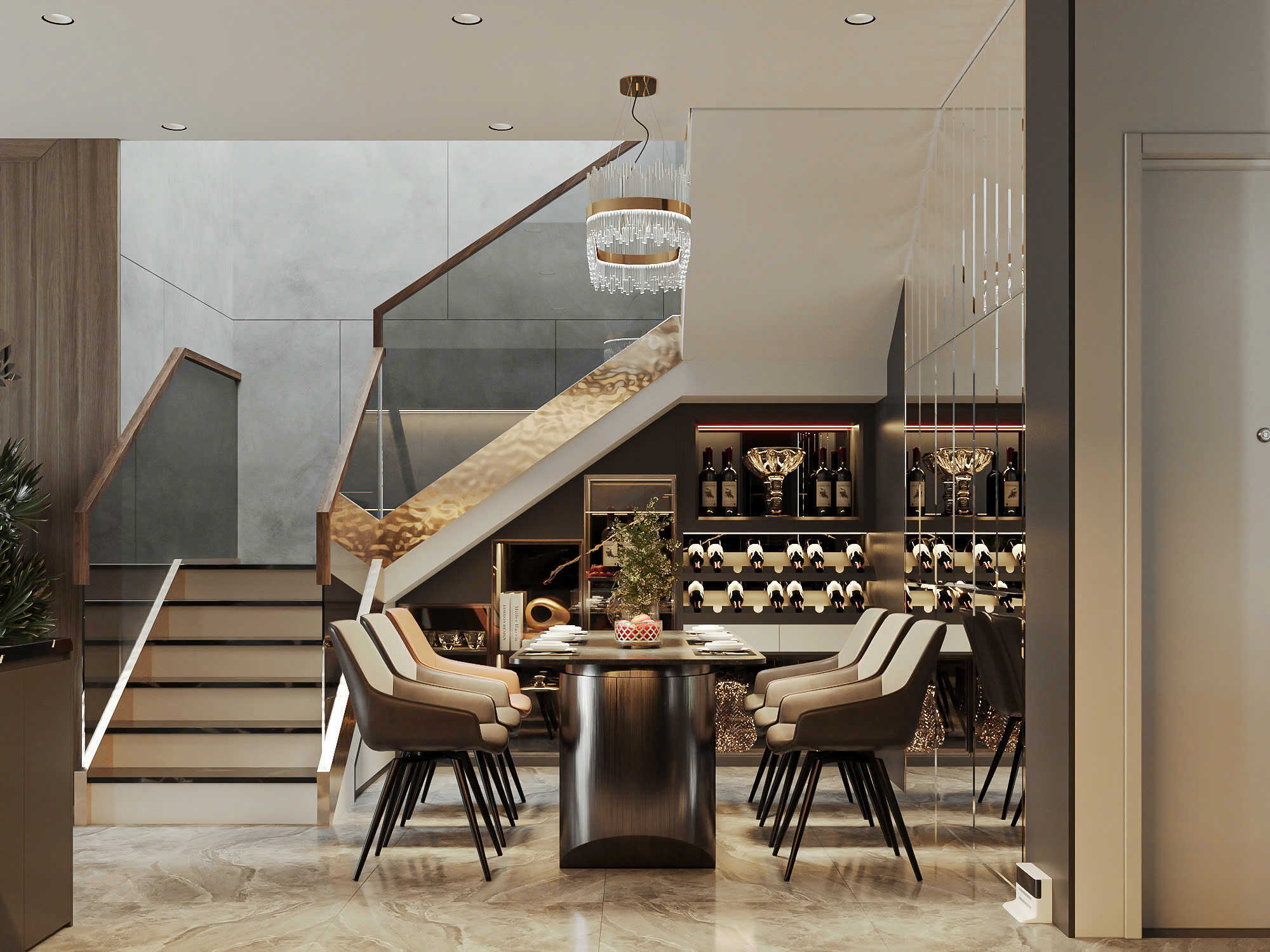 Hình ảnh khu vực cầu thang và bàn ăn cho thấy một không gian mở, liên thông, tạo sự kết nối liền mạch giữa các khu vực chức năng.