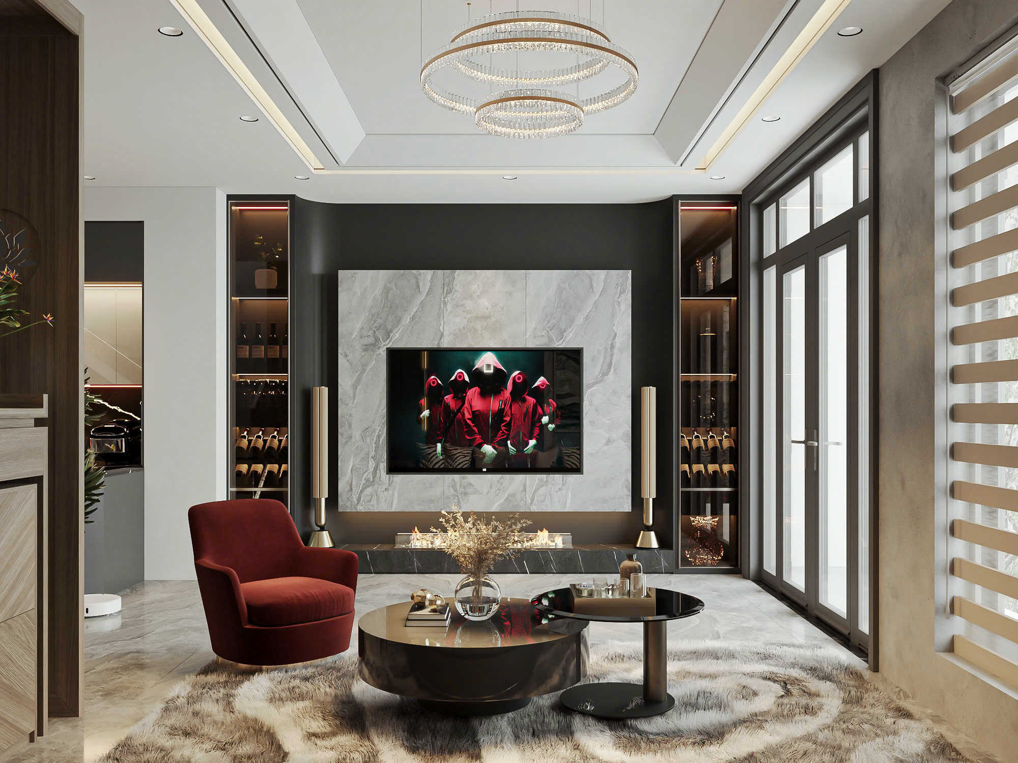 - Bố cục: Khu vực tivi với bức tường ốp đá vân mây là một điểm nhấn cực kỳ ấn tượng. Đá mang năng lượng của đất, tạo sự vững chãi, bền vững. Việc đặt tivi trên nền đá cẩm thạch cũng là một cách để "giữ chân" tài lộc trong nhà. Kệ tủ âm tường hai bên tivi vừa tối ưu không gian, vừa là nơi trưng bày những vật phẩm trang trí, rượu quý – thể hiện sở thích sưu tầm và gu sống của gia chủ. Đặc biệt, chiếc lò sưởi giả với hiệu ứng lửa bập bùng không chỉ tạo điểm nhấn ấm cúng mà còn tượng trưng cho nguồn năng lượng Hỏa, giúp sưởi ấm không gian và kích hoạt sự thịnh vượng.
