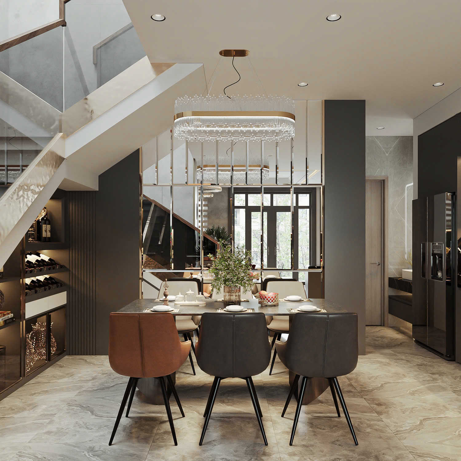 - Bàn ăn: Bàn ăn tròn với những chiếc ghế bọc da sang trọng là biểu tượng của sự sum vầy, đoàn tụ. Bàn tròn trong phong thủy tượng trưng cho sự viên mãn, trọn vẹn, không có góc cạnh sắc nhọn gây sát khí. Ánh đèn chùm phía trên bàn ăn không chỉ chiếu sáng mà còn tượng trưng cho sự ấm cúng, đủ đầy của mỗi bữa ăn gia đình.