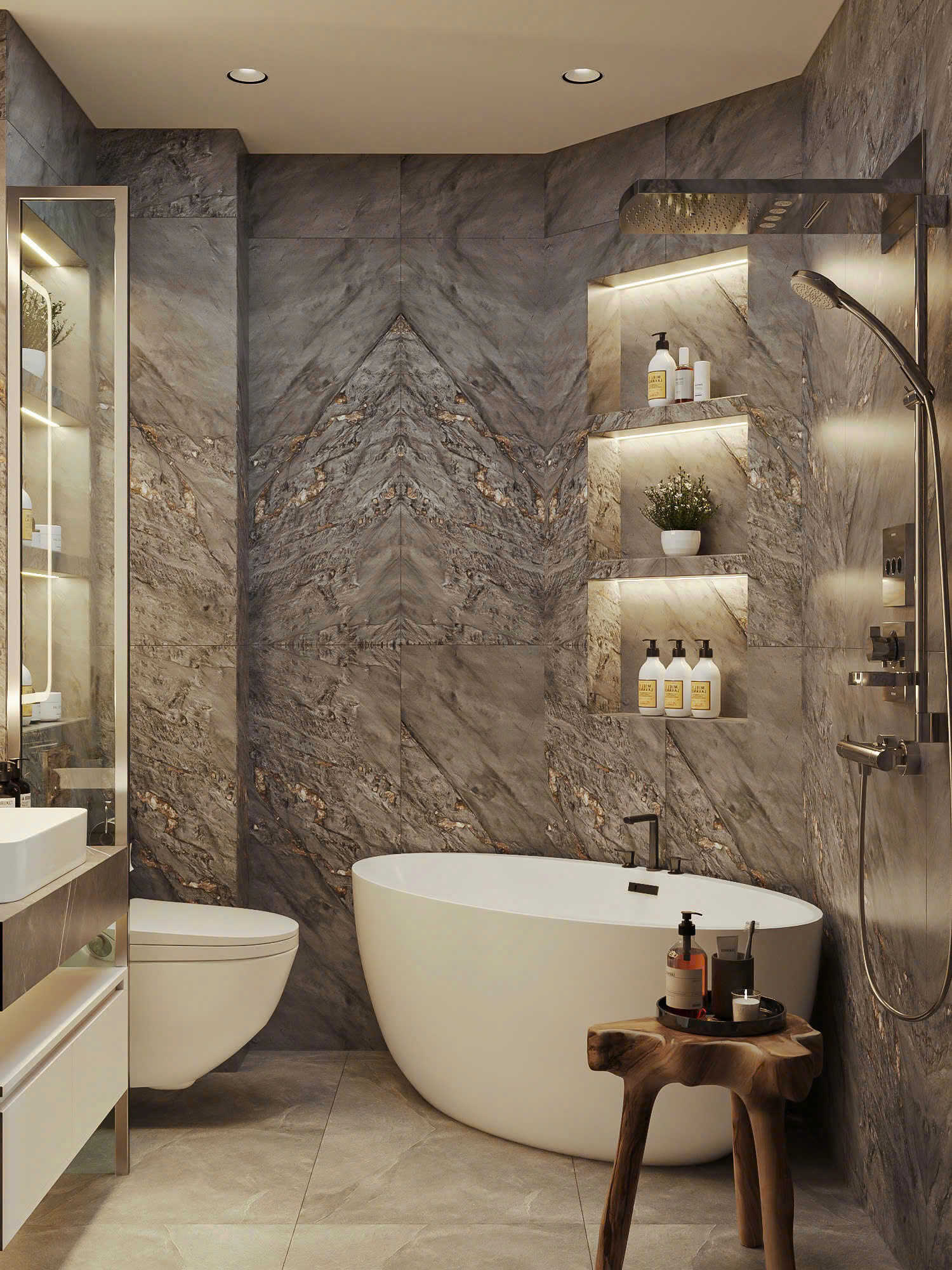 - Vật liệu đá tự nhiên: Toàn bộ phòng tắm được ốp đá tự nhiên với những đường vân độc đáo, tạo cảm giác gần gũi với thiên nhiên và mang lại năng lượng của đất, giúp cân bằng và làm sạch.