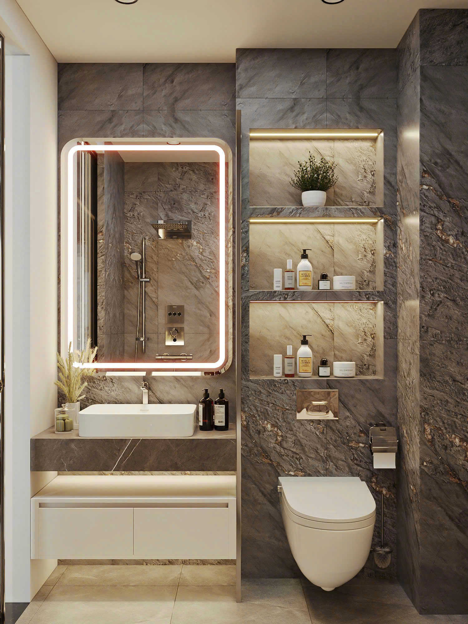- Kệ âm tường: Việc bố trí các kệ âm tường có đèn chiếu sáng vừa tiện lợi cho việc sắp xếp đồ dùng, vừa tạo điểm nhấn thẩm mỹ và giúp năng lượng lưu thông tốt hơn, tránh sự tù đọng.