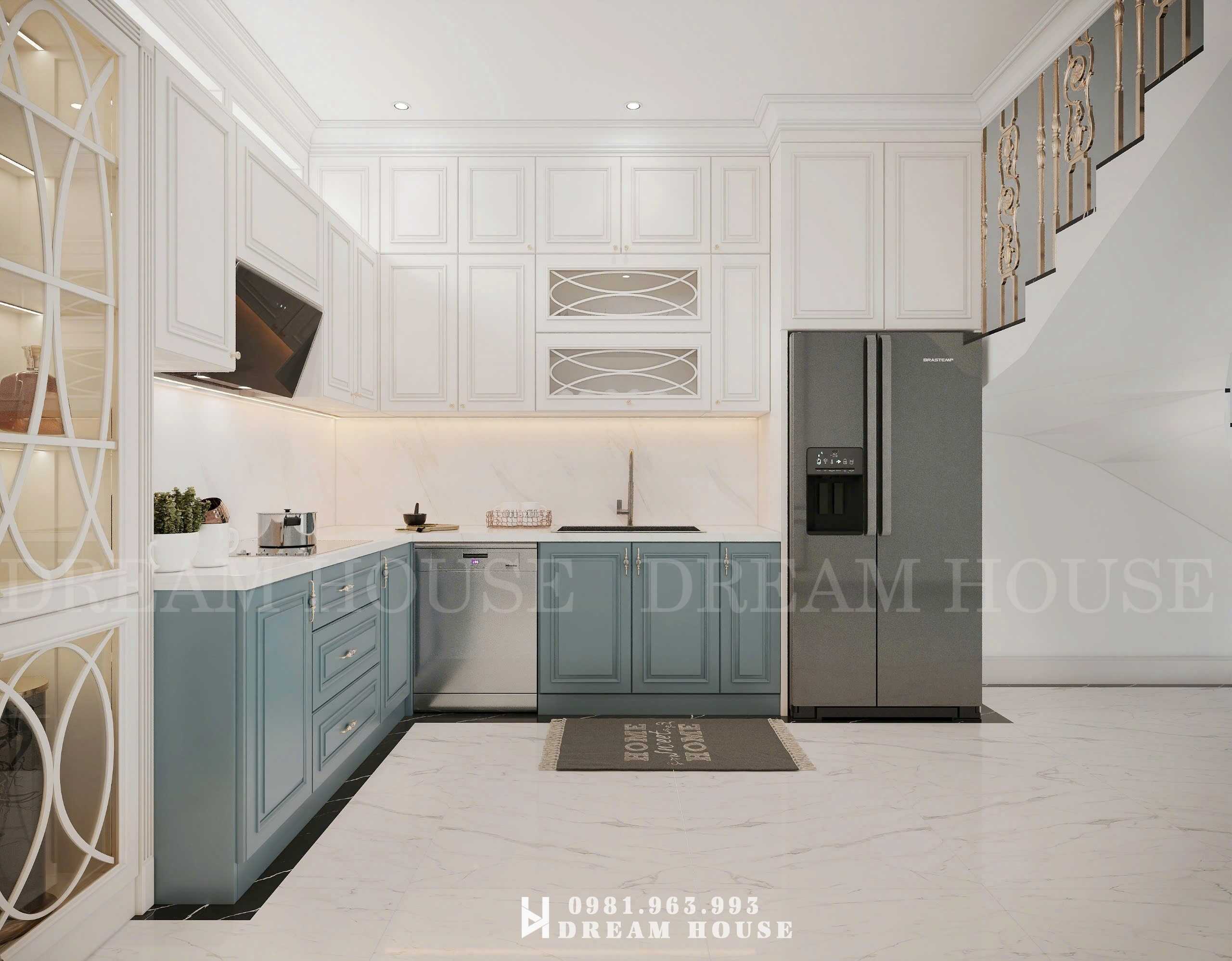 Ngay khi bước vào căn bếp, điều đầu tiên đập vào mắt là cảm giác sang trọng và tinh tế đến từ tone trắng chủ đạo kết hợp xanh rêu nhạt – vừa nhẹ nhàng, vừa mang cảm giác gần gũi thiên nhiên. Bộ tủ bếp trên – dưới cao kịch trần, tối ưu hóa công năng lưu trữ nhưng vẫn giữ được độ thoáng nhờ hệ tủ kính chia ô đối xứng và hệ đèn âm dịu mắt.