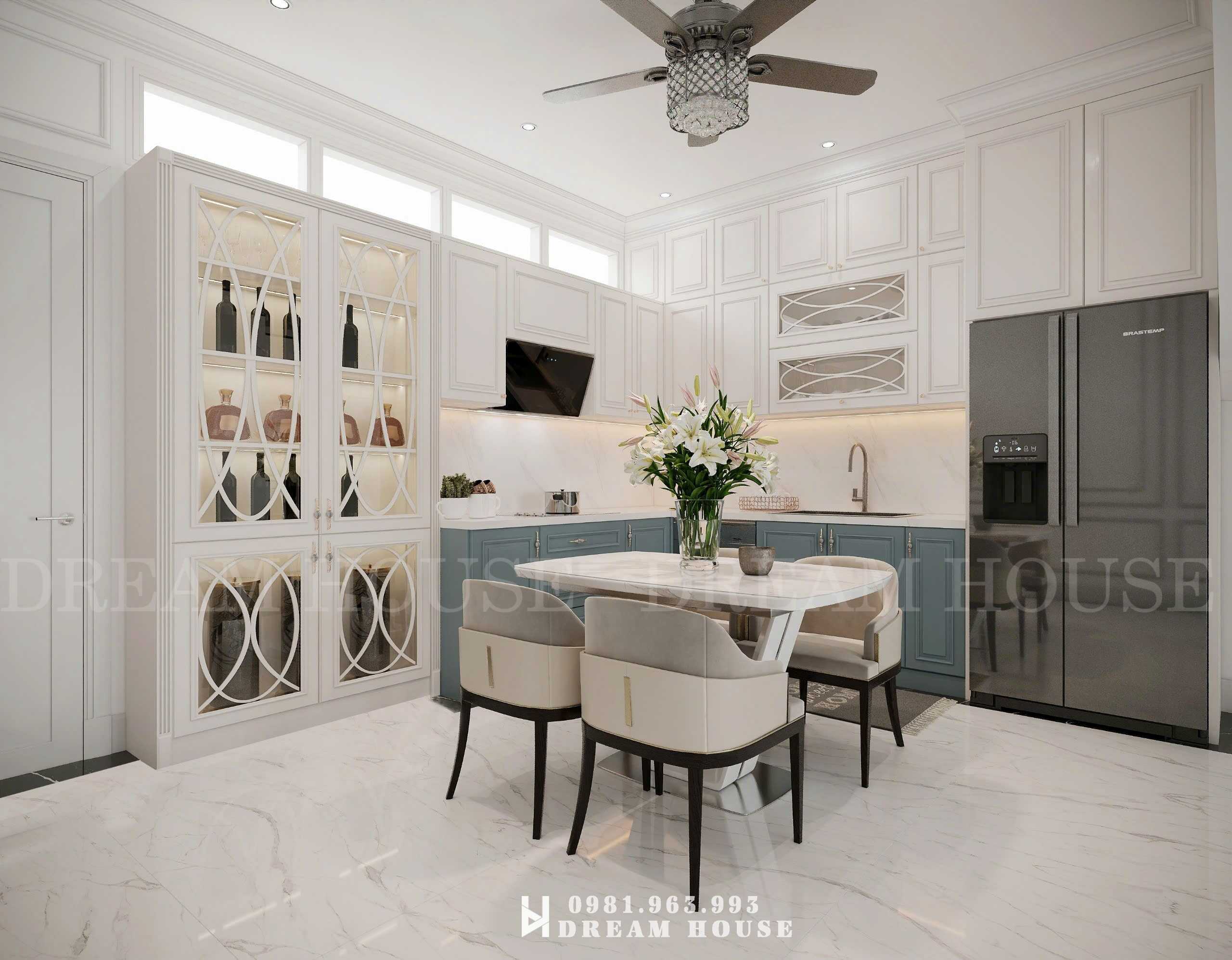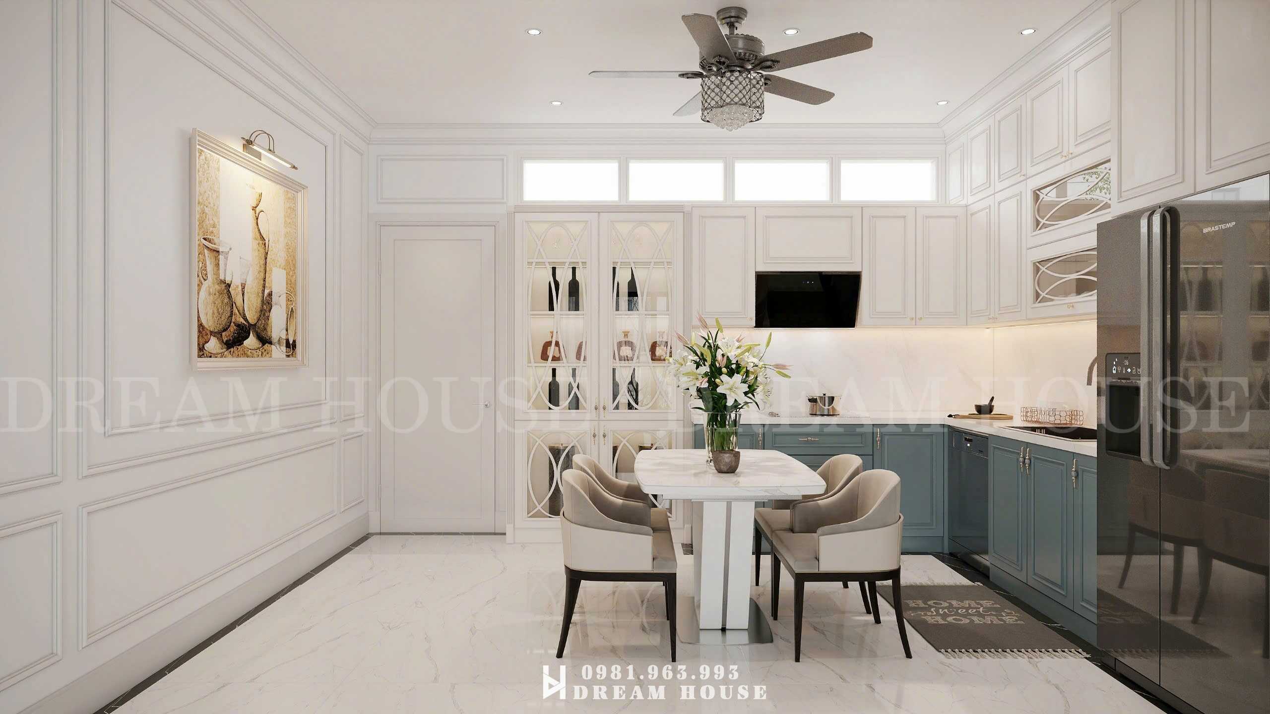 Điểm cộng lớn trong thiết kế này là bàn ăn mặt đá trắng vân mây đi cùng bộ ghế nhung dáng cong – không chỉ đẹp mắt mà còn rất êm ái, tạo nên cảm giác thư thái trong từng bữa cơm gia đình.