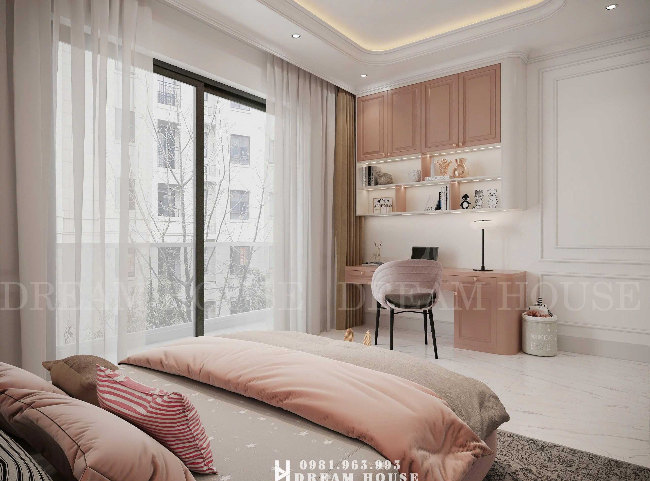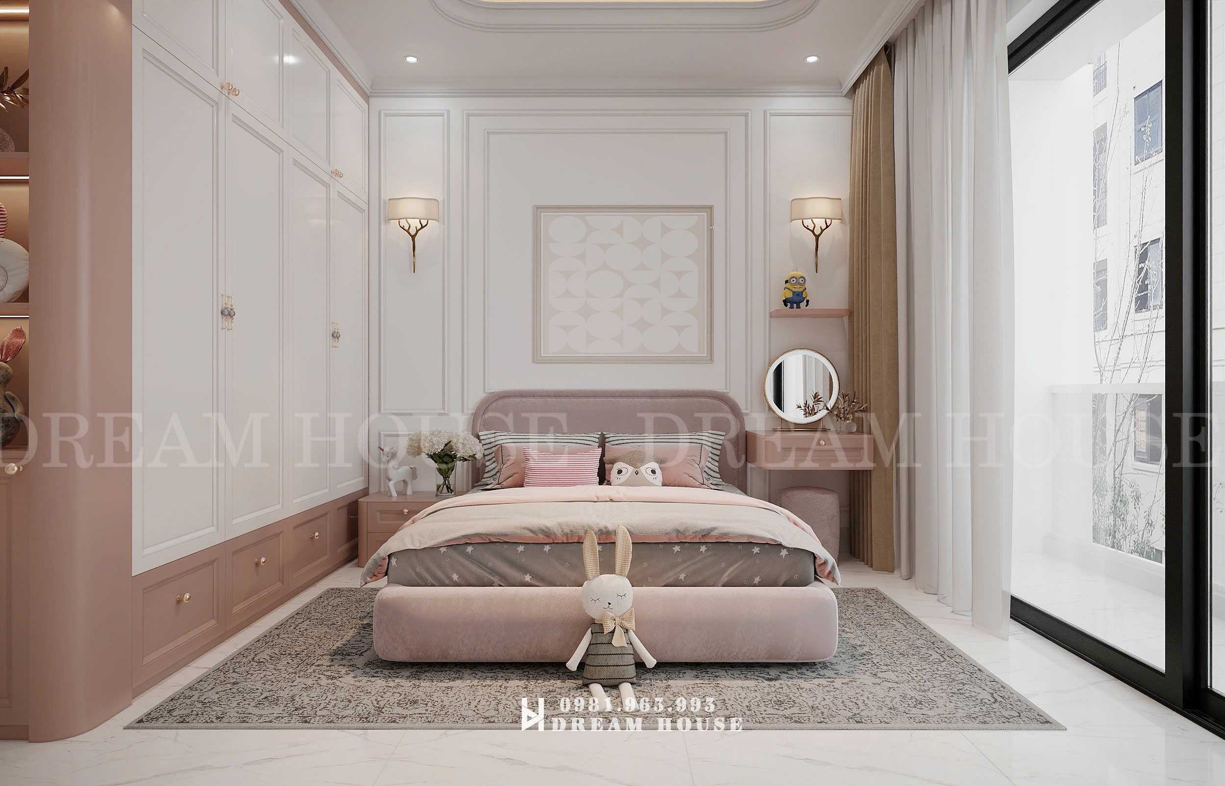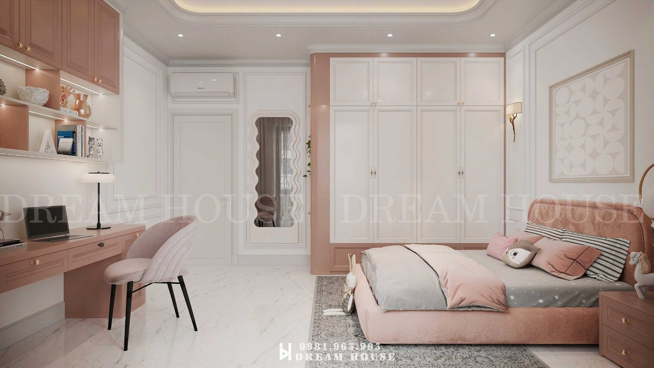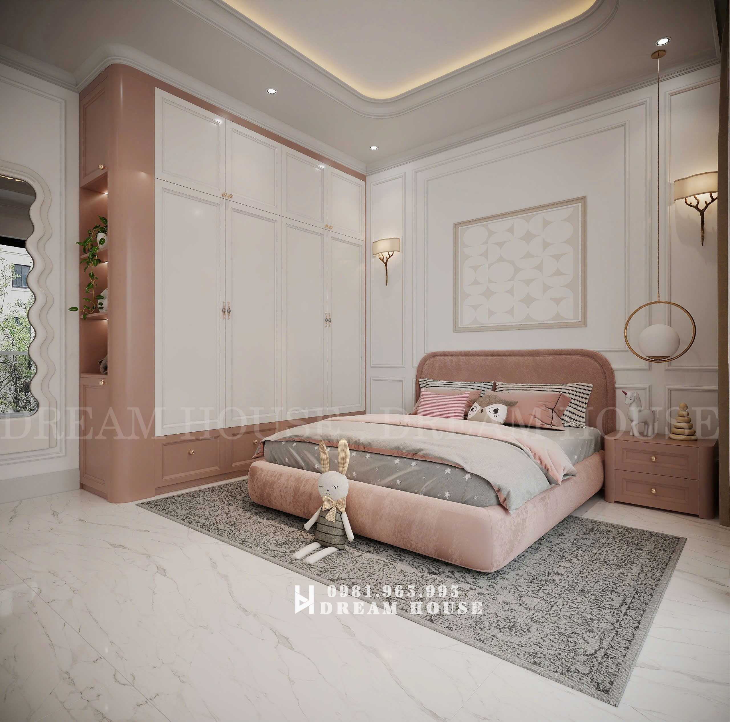 Phòng ngủ của bé gái được phối màu hồng pastel kết hợp trắng sữa – không chỉ hợp xu hướng mà còn đánh trúng tâm lý của các bé yêu thích sự nhẹ nhàng, nữ tính.