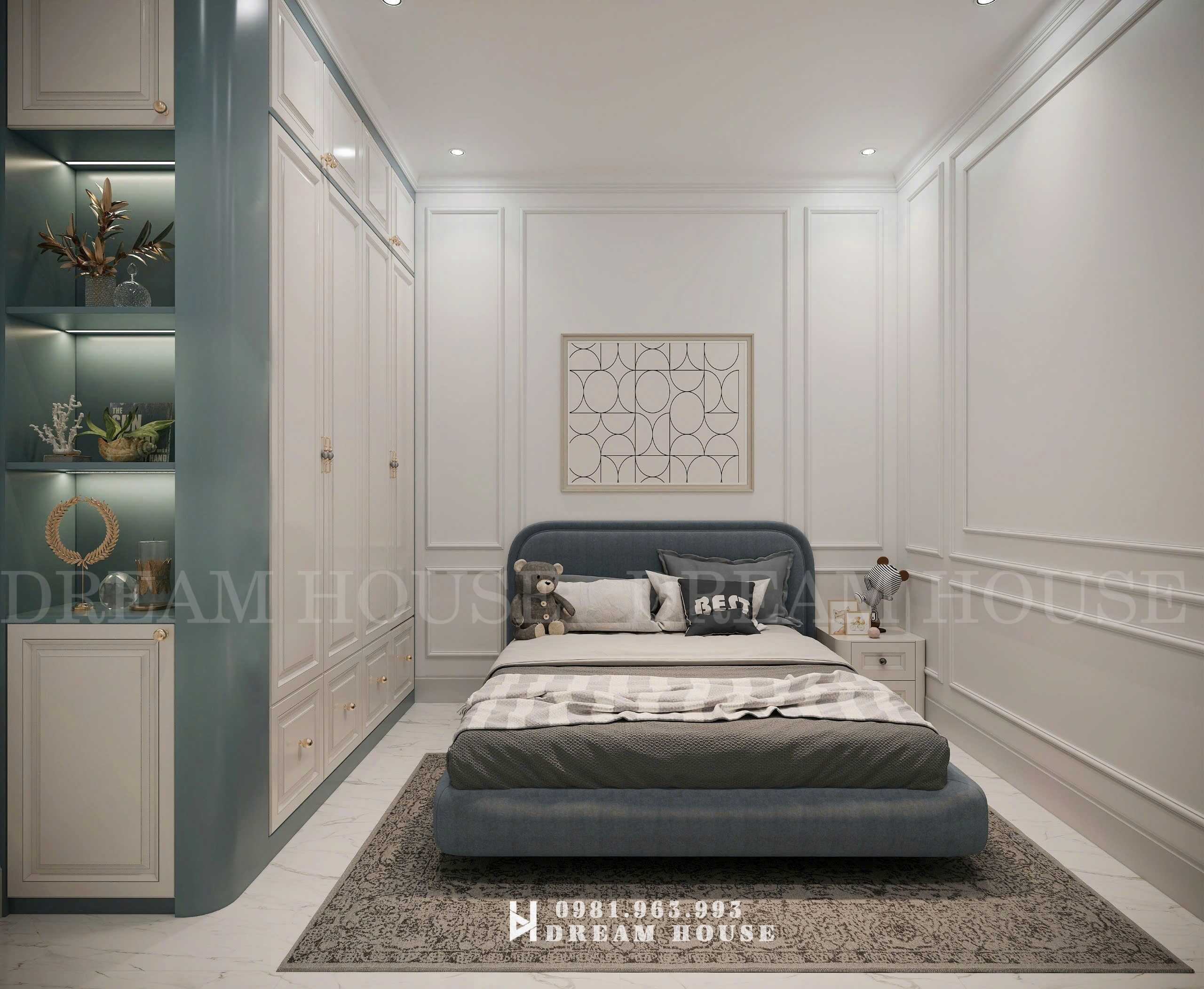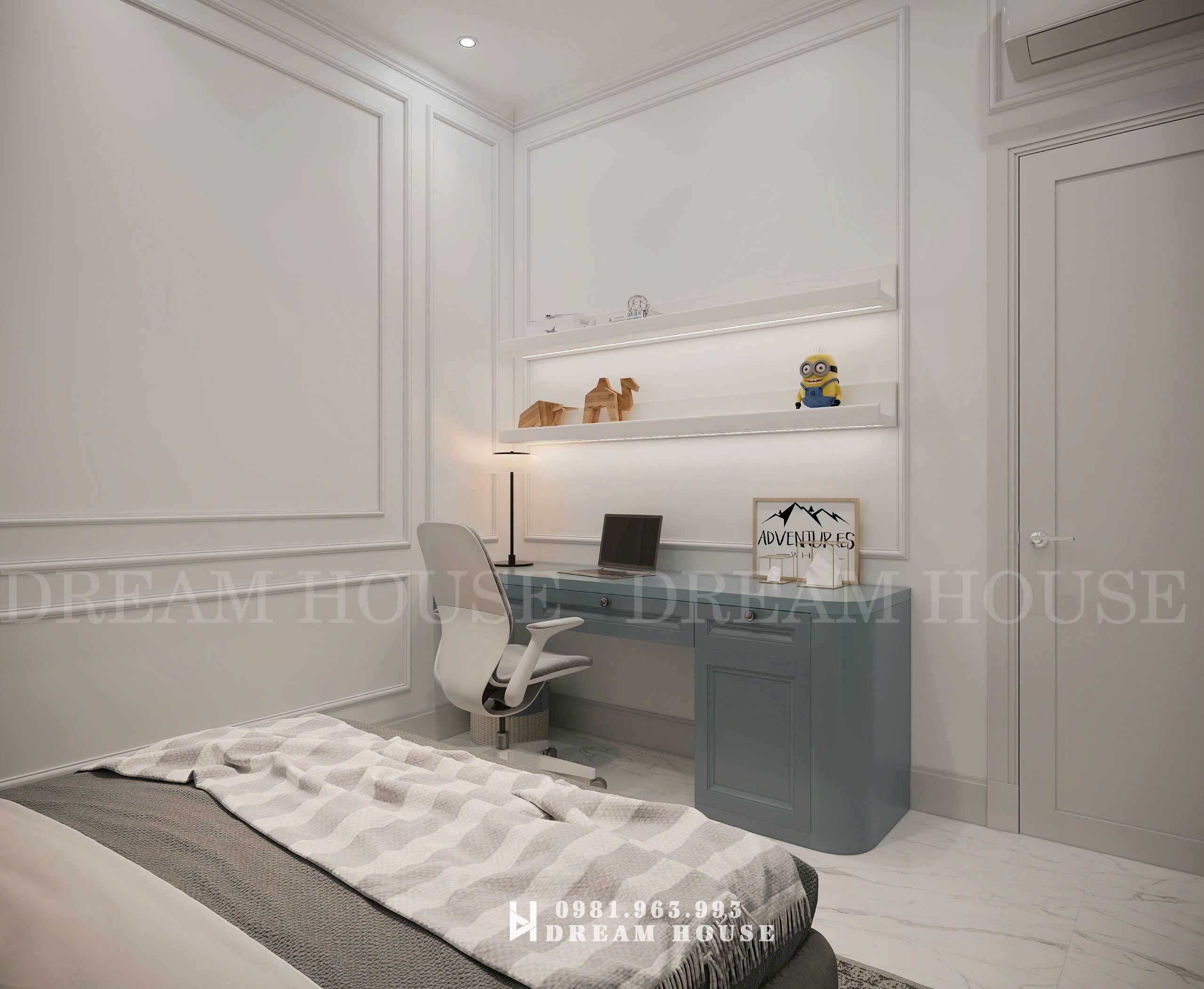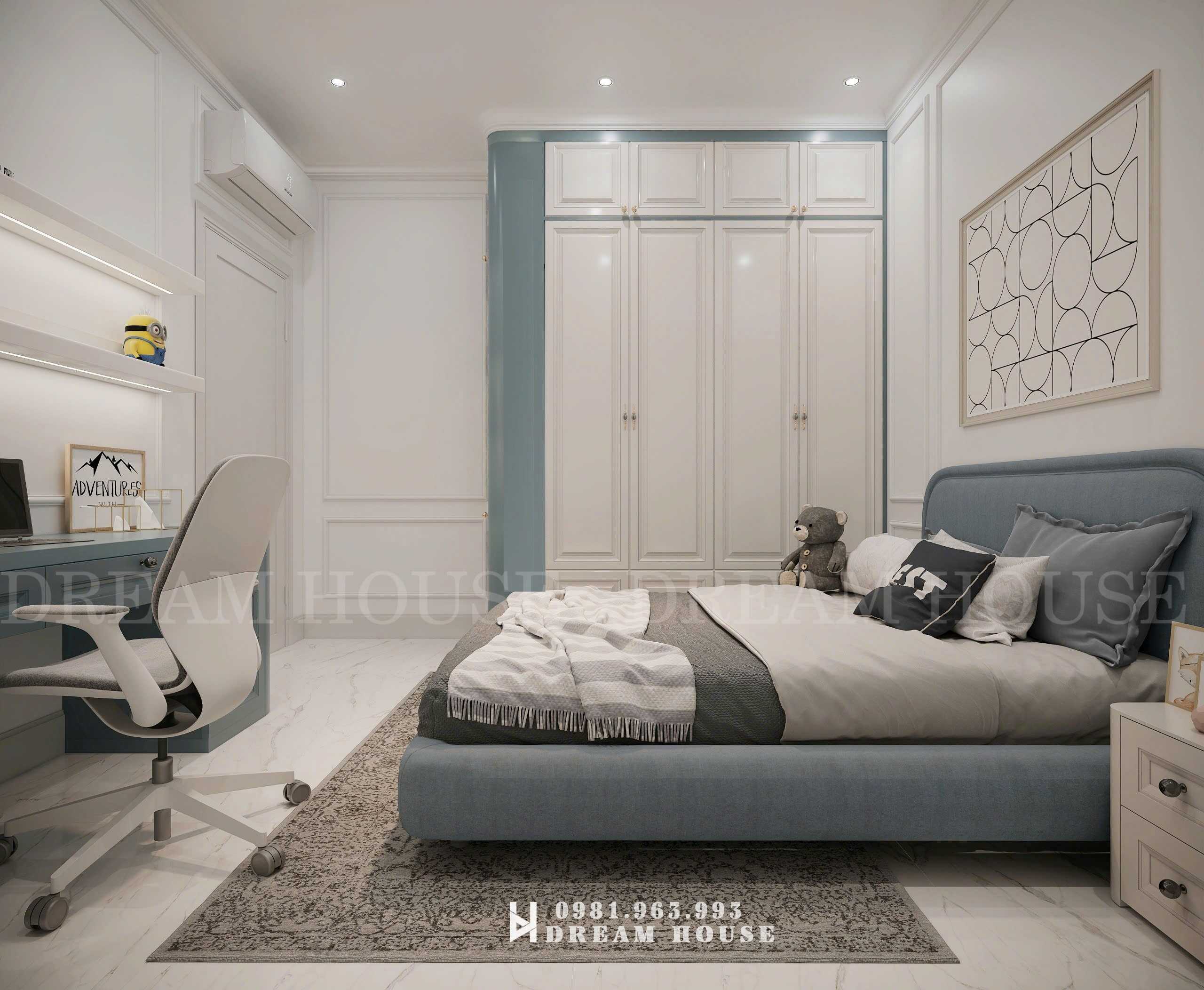 Điểm nổi bật ở đây là góc học tập khoa học với ghế công thái học, đèn học LED và giá sách dạng mở – kích thích tư duy sáng tạo, giúp con luôn có cảm hứng học tập. Ngoài ra, hệ tủ âm tường kết hợp tay nắm nhỏ gọn tạo cảm giác tinh giản nhưng vẫn đầy đủ công năng.