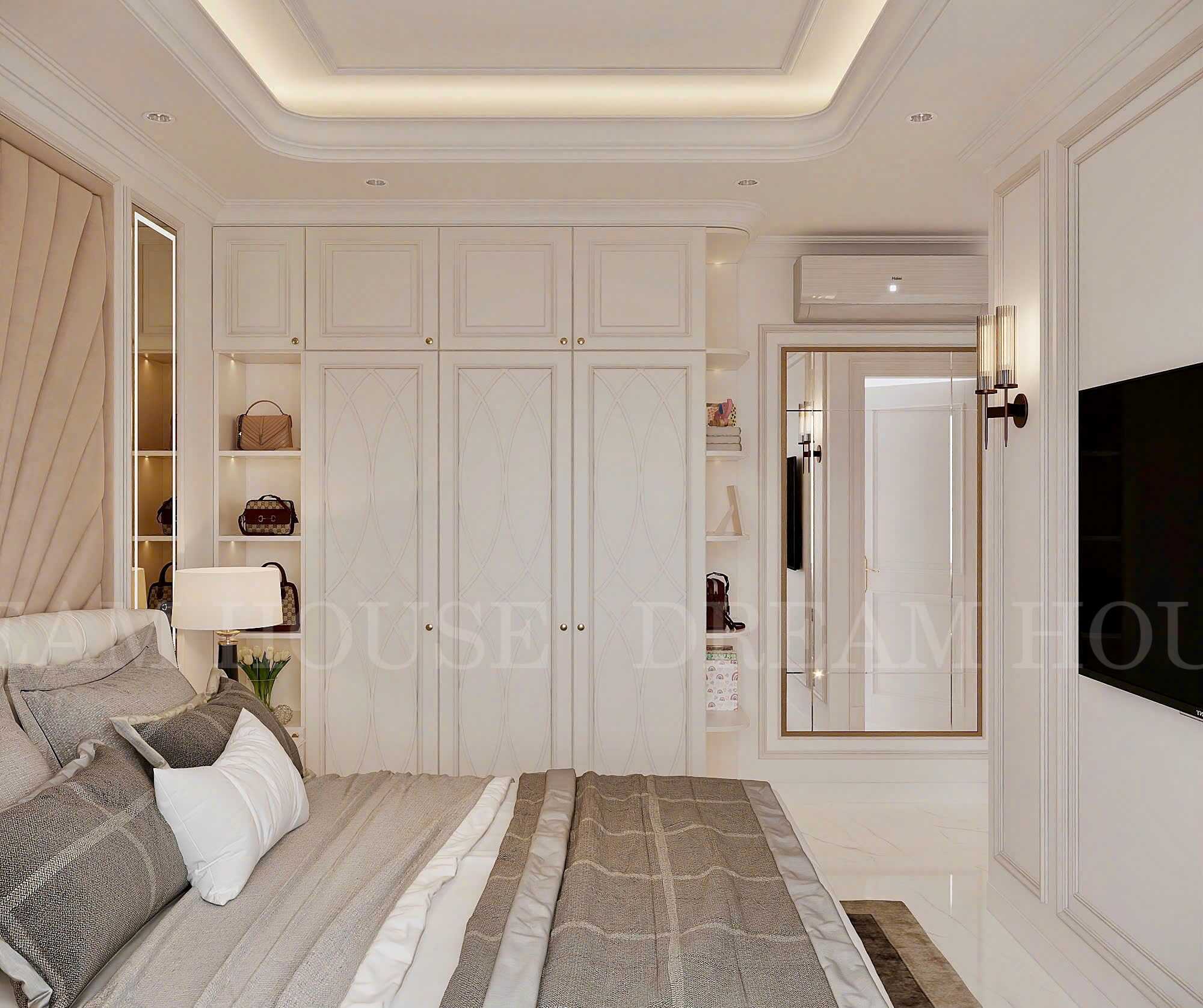 Hệ tủ âm tường cao sát trần không chỉ giúp tối ưu hóa không gian mà còn mang lại vẻ liền mạch và gọn gàng. Điểm tôi rất thích ở căn phòng này là ánh sáng gián tiếp từ hắt trần – vừa hiện đại, vừa êm dịu, giúp giấc ngủ luôn được đảm bảo chất lượng tốt nhất