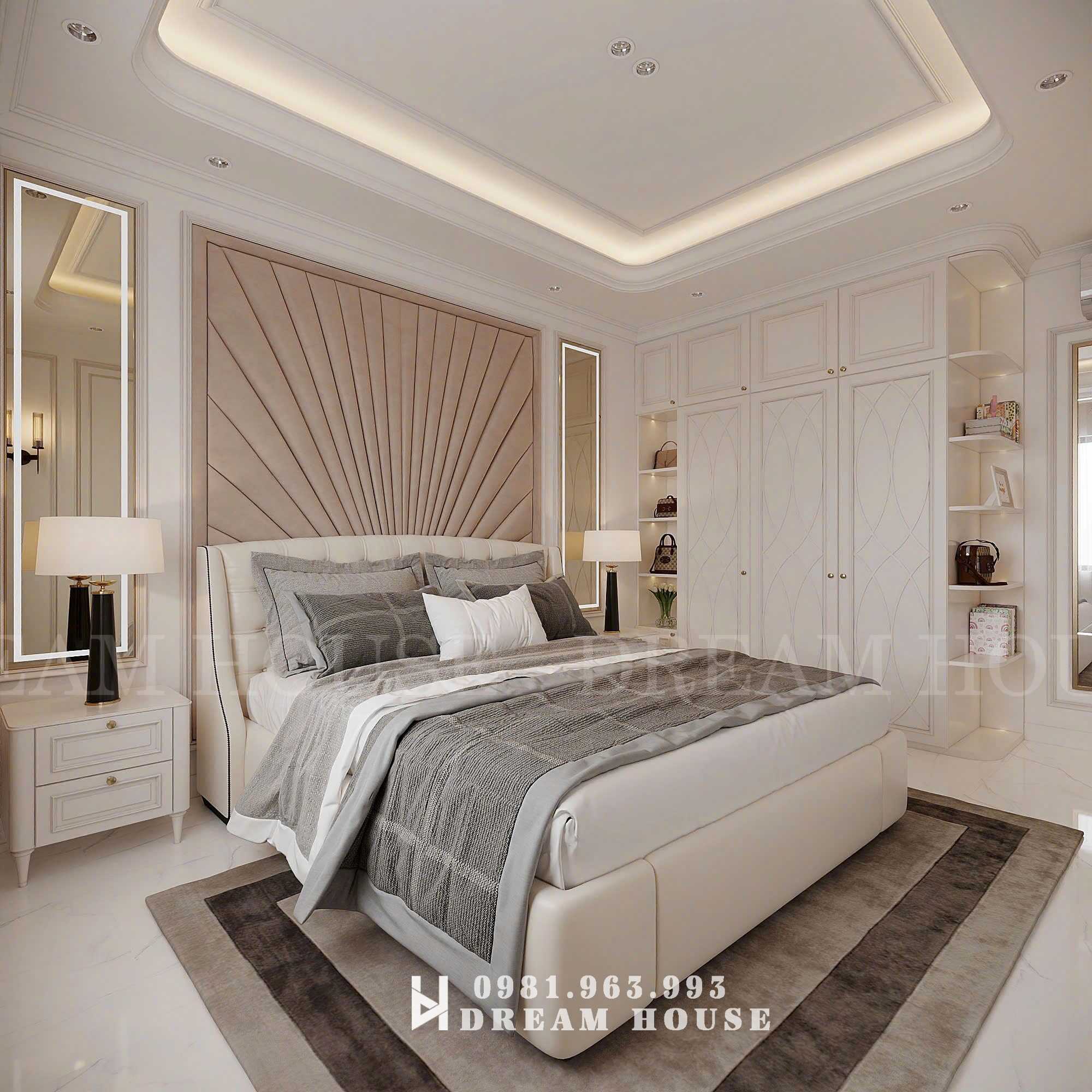 Toàn bộ không gian được phối hợp hài hòa giữa các sắc độ trắng, be, ghi – trung tính nhưng không hề đơn điệu. Giường bọc da cao cấp, kết hợp cùng bộ chăn ga gối đơn sắc, tôn lên vẻ đẹp sang trọng mà không quá phô trương.