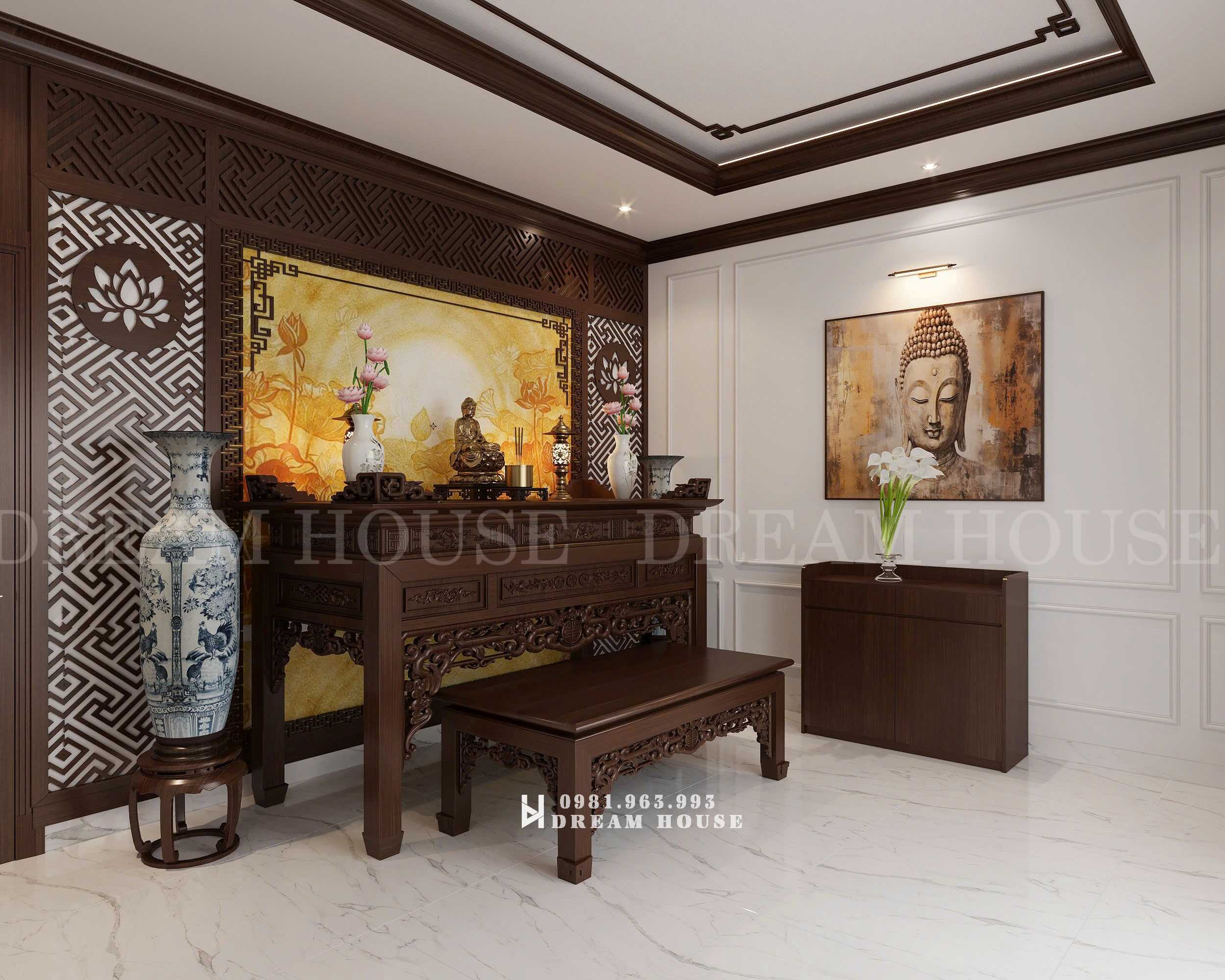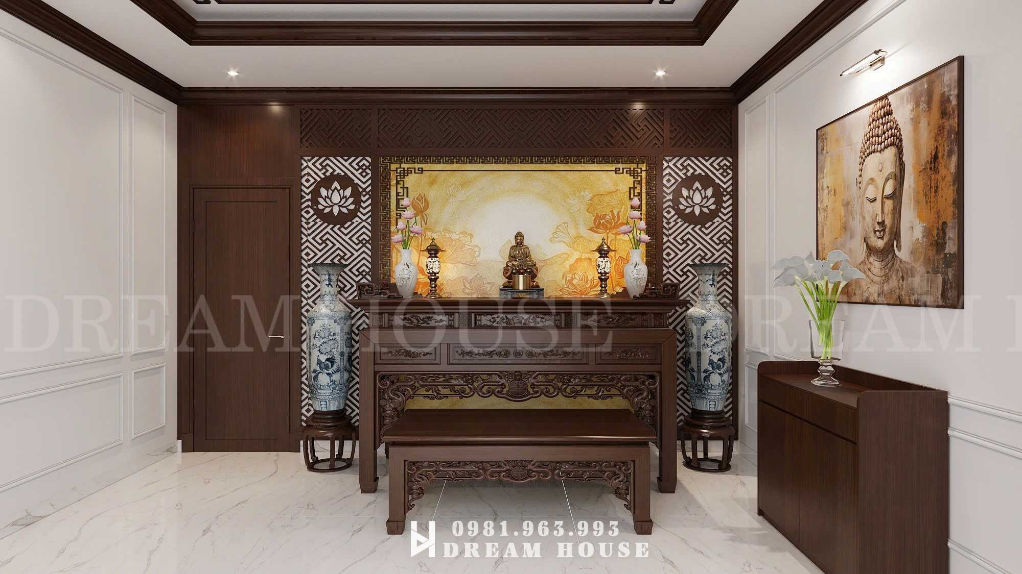 Một trong những không gian khiến tôi ấn tượng nhất chính là phòng thờ của gia chủ. Thiết kế mang đậm yếu tố Á Đông với gỗ tự nhiên màu nâu sậm, họa tiết chạm khắc hoa sen – phúc lộc thọ – chữ vạn, kết hợp cùng bức tranh phật lớn treo trang trọng giữa phòng.