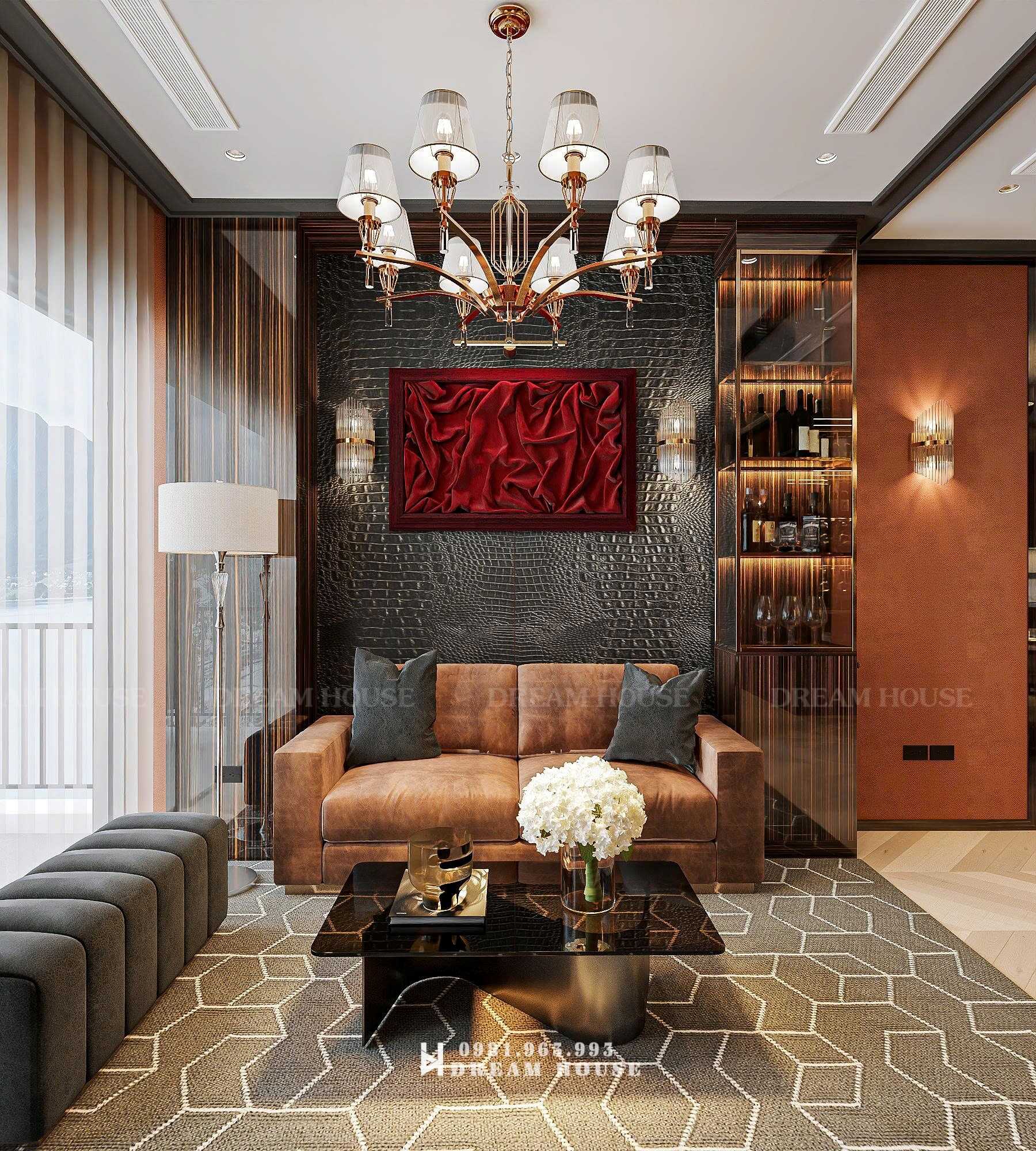 Hãy cùng ngắm nhìn và tưởng tượng bạn đang bước vào không gian phòng khách của ngôi nhà này. Ánh sáng dịu nhẹ từ chiếc đèn chùm pha lê lộng lẫy lan tỏa khắp không gian, vẽ nên những vệt sáng lung linh trên bề mặt đá cẩm thạch sang trọng. Bộ sofa bọc da cao cấp với tông màu nâu be ấm áp mời gọi bạn ngả lưng, trong khi chiếc bàn trà mặt kính đen tuyền với chân đế đỏ đô tạo nên điểm nhấn mạnh mẽ, đầy nghệ thuật.